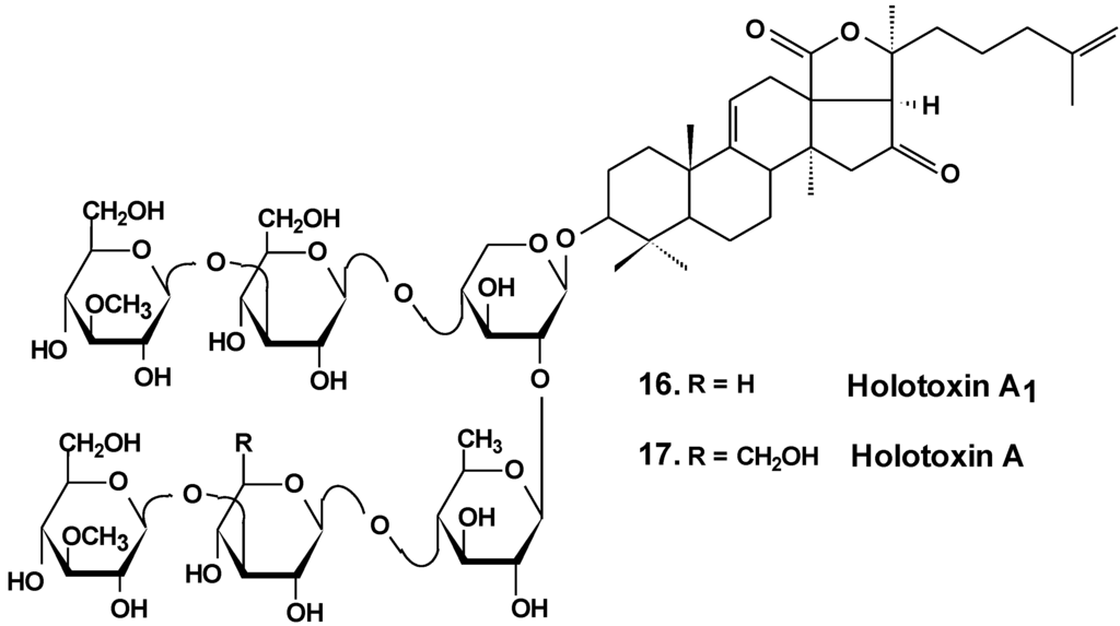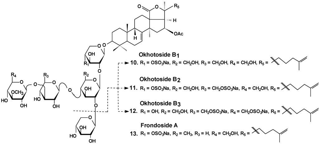 Okhotosides B1 (10), B2 (11) and B3 (12) from Cucumaria okhotensis (Chart 6) were moderately toxic against cells of HeLa tumor. Frondoside A (13) isolated from the same holothurian revealed more potent cytotoxicity against THP-1 and against HeLa tumor cells (with IC50 values of 4.5 and 2.1 μg/mL, respectively). This substance decreased both the AP-1-dependent trascriptional activities induced by UVB, EGF, or TPA in JB6-LucAP-1 cells and the EGF-induced NF-κB-dependent transcriptional activity in JB6-LucNF-κB cells at doses of about 1 μg/mL. Frondoside A increased the p53-dependent transcriptional activity in nonactivated JB6-Lucp53 cells at the same doses. It also inhibited the colony formation of JB6 P (+) Cl 41 cells activated with EGF (INCC50 = 0.8 μg/mL) [36].