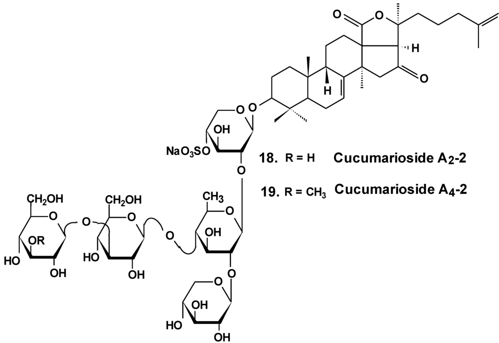 Sea cucumber triterpene glycosides with differing chemical structures were examined in vitro for effects against leukemia cell lines. Cucumariosides A2-2 (18) and A4-2 (19) from Cucumaria japonica (Chart 9) and stichoposides С (14) and D (15) from Thelenota anax, in cytotoxic doses, were shown to induce apoptosis in human leukemia cells HL-60, THP-1, NB-4 and K562 in vitro by a caspase-dependent mechanism. Thus, sea cucumber triterpene glycosides, in spite of differing molecular structures, may nonetheless have generalized therapeutic relevance for human cancer [48].