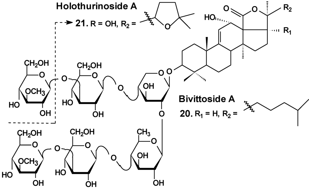 Structure of bivittoside A and holothurinoside A.