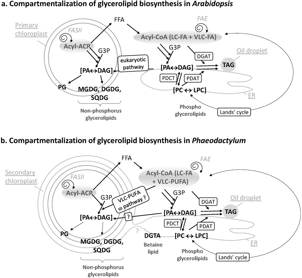 (a) Compartmentalization of glycerolipid biosynthesis in Arabidopsis. The FA synthase of type II (FASII) is located inside chloroplasts. Neo-synthesized acyl-ACP can be converted into free FAs (FFA), exported and thio-esterified to coenzyme A. Cytosolic acyl-CoA can serve for the esterification of glycerol-3-phosphate (G3P) into phosphatidic acid (PA) and its dephosphorylated form diacylglycerol (DAG). In the ER, PA, and DAG are precursors for phospholipids like phosphatidylcholine (PC). PC can undergo an acyl-editing cycle (Lands cycle), by the hydrolysis of a FA at position sn-2 followed by a re-acylation with an FA obtained from the acyl-CoA pool (dashed lines). In Arabidopsis, this process is known to incorporate more neo-synthesized fatty acids into ER glycerolipids than the stepwise acylation of G3P. Polar head exchanges can occur by the action of a PC-DAG phosphocholine transferase (PDCT), leading to the coexistence of de novo-synthesized or PC-derived DAG molecules with distinct FA molecular species. A third acyl can be added to DAG to form TAG, either obtained from the acyl-CoA pool by a DAG acyltransferase (DGAT) activity or by transfer from a PC molecule by a PC-DAG acyltransferase (PDAT) activity. Overall, this pathway in the ER is called the eukaryotic pathway. In chloroplasts, the prokaryotic pathway generates PA and DAG and lipids like mono and digalactosyldiacylglycerol (MGDG, DGDG), sulfoquinovosyldiacylglycerol (SQDG), or phosphatidylglycerol (PG). Some eukaryotic precursors are imported to the chloroplast; (b) Compartmentalization of glycerolipid biosynthesis in Phaeodactylum. Similar pathways are predicted to occur. Some specific features, like the import of very-long chain polyunsaturated fatty acids (VLC-PUFA) in plastid, via the omega pathway, are highlighted.