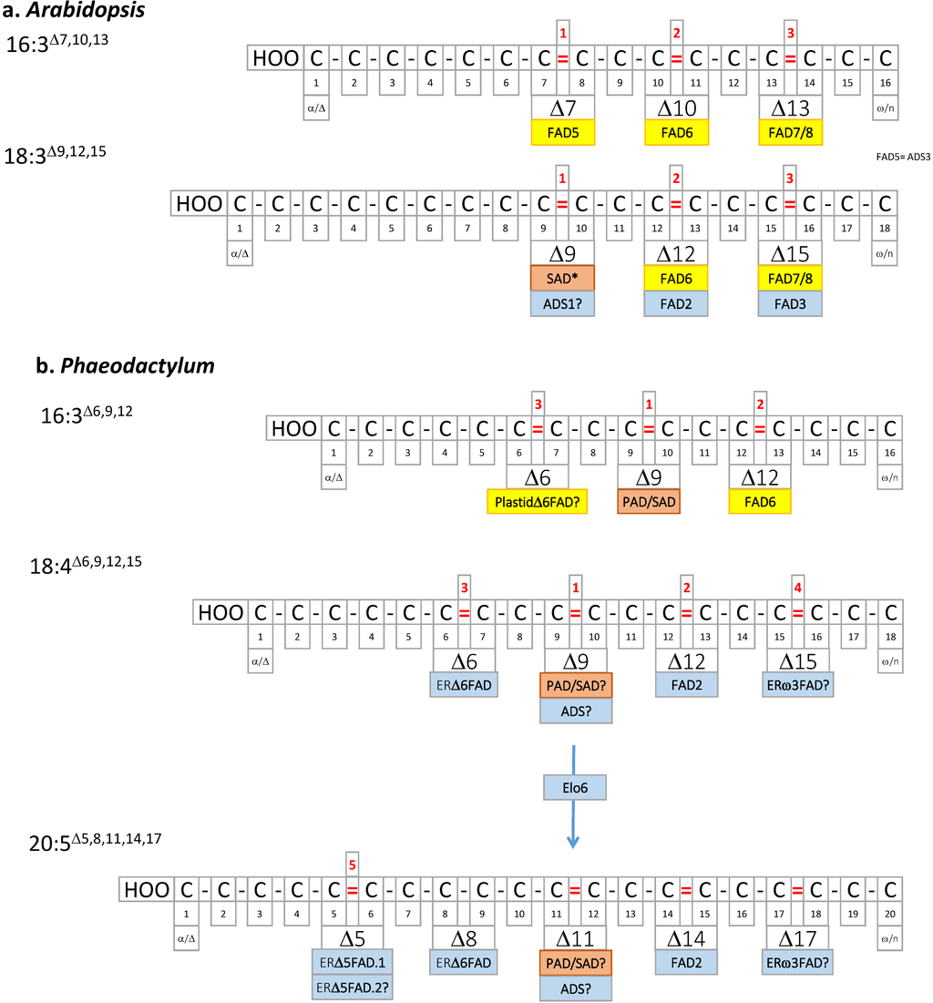 (a) Arabidopsis PUFAs; (b) Phaeodactylum PUFAs. Double bonds are localized based on the Δ nomenclature. Desaturases catalyzing the introduction of the corresponding double bond are shown in pink (stroma of chloroplast enzyme), yellow (chloroplast membrane enzymes), or light blue (ER membrane enzymes). Elo6, elongase.