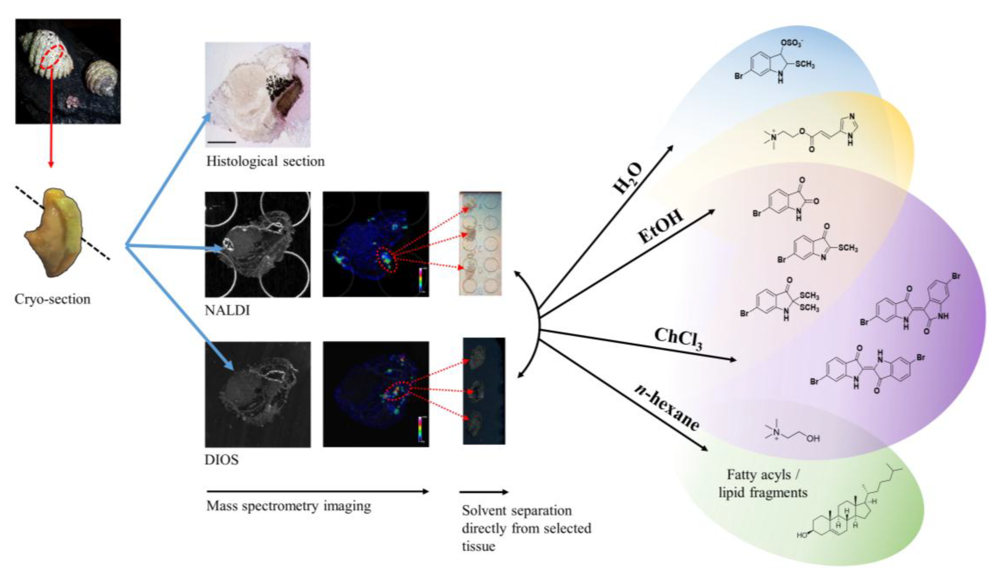 Here we describe the use of “on-surface” solvent separation of secondary metabolites from tissue imprints of the biosynthetic regions of a marine mollusc (Figure 1). This process allowed solvent extraction of subsets of secondary metabolites, according to polarity, directly from hypobranchial tissue onto nanostructured surfaces for immediate LDI-MS to gain qualitative and relative quantitative data that is compatible with LDI-imaging data [19]. Water (H2O), ethanol (EtOH), chloroform (CHCl3) and n-hexane were independently applied to tissue, to cover a typical solvent profile able to capture hydrophilic to lipophilic low molecular weight secondary metabolites (Figure 1). The identification of particular secondary metabolites that were either retained in the tissue imprints, or washed onto the nanostructured surfaces after solvent separation (Figure 2), was confirmed by standard extraction methods and solvation characteristics, e.g., LogP. Relative quantification of secondary metabolites on the nanostructured surfaces was determined against available standards for 6-bromoisatin, tyrindoleninone and Tyrian purple. Nanostructured surfaces provide an excellent platform for spatial analysis of secondary metabolites [33] using LDI and simple chromatographic manipulations can greatly simplify annotation and de-replication efforts [34]. Direct solvent extraction onto nanostructured surfaces from biosynthetic hypobranchial tissue regions allows rapid and simplified quantitative and qualitative analysis of both brominated indoles and choline esters in the absence of spectra that would otherwise suppress detection.