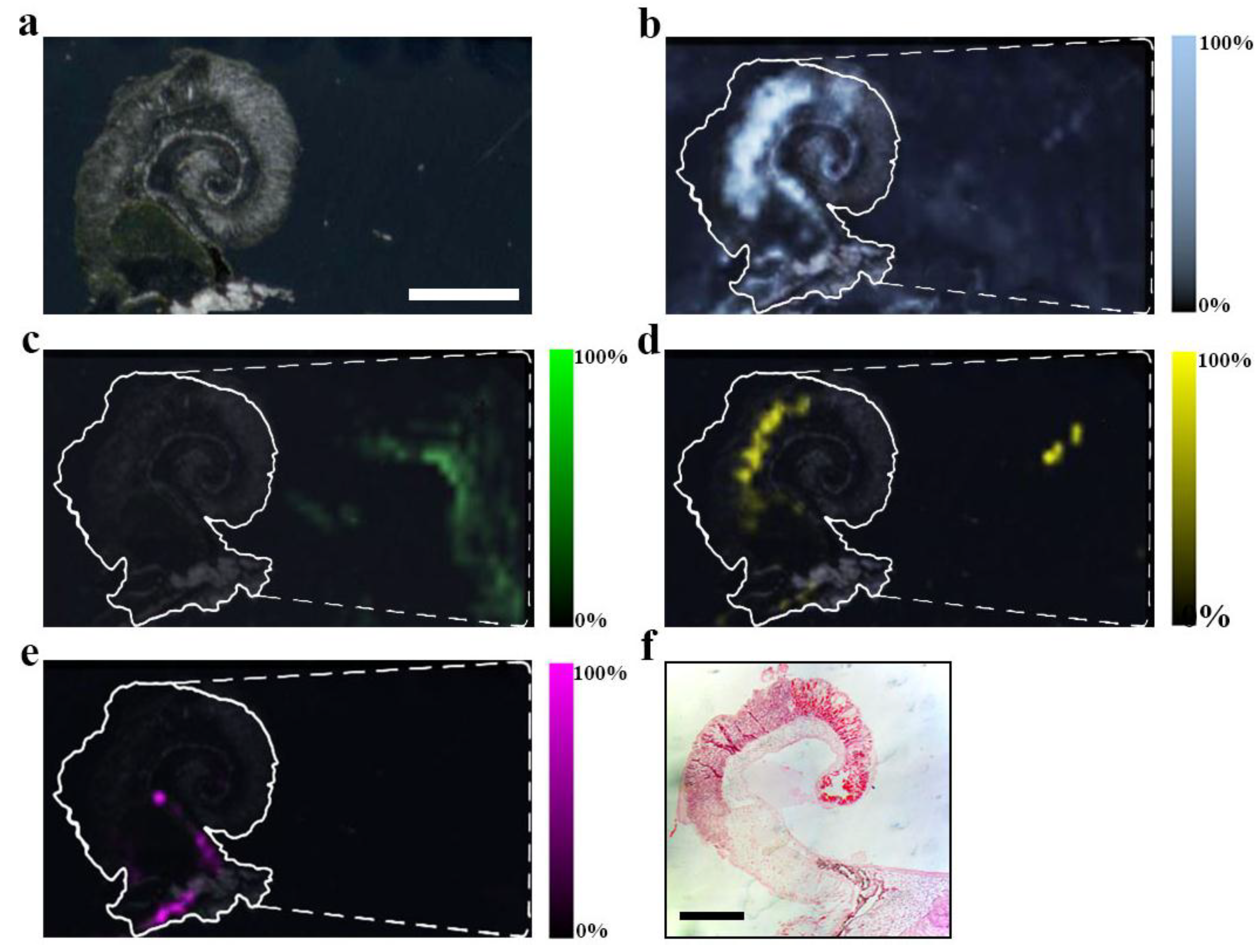 MSI detection region after EtOH separation of secondary metabolites on a DIOS surface. 15 μm thick tissue sections were imprinted onto the nanostructured surface then washed by gently pipetting solvent over the imprint area, onto a clean section of the surface (-----), where the solvent was then allowed to evaporate before LDI-MS; (a) scan of tissue on DIOS; (b) MSI of murexine 224 m/z; (c) MSI of tyrindoxyl sulfate 340 m/z; (d) MSI of tyrindoleninone 256 m/z; (e) MSI of Tyrian purple 421 m/z and (f) example an histological tissue section of the hypobranchial region stained with haematoxylin and eosin.