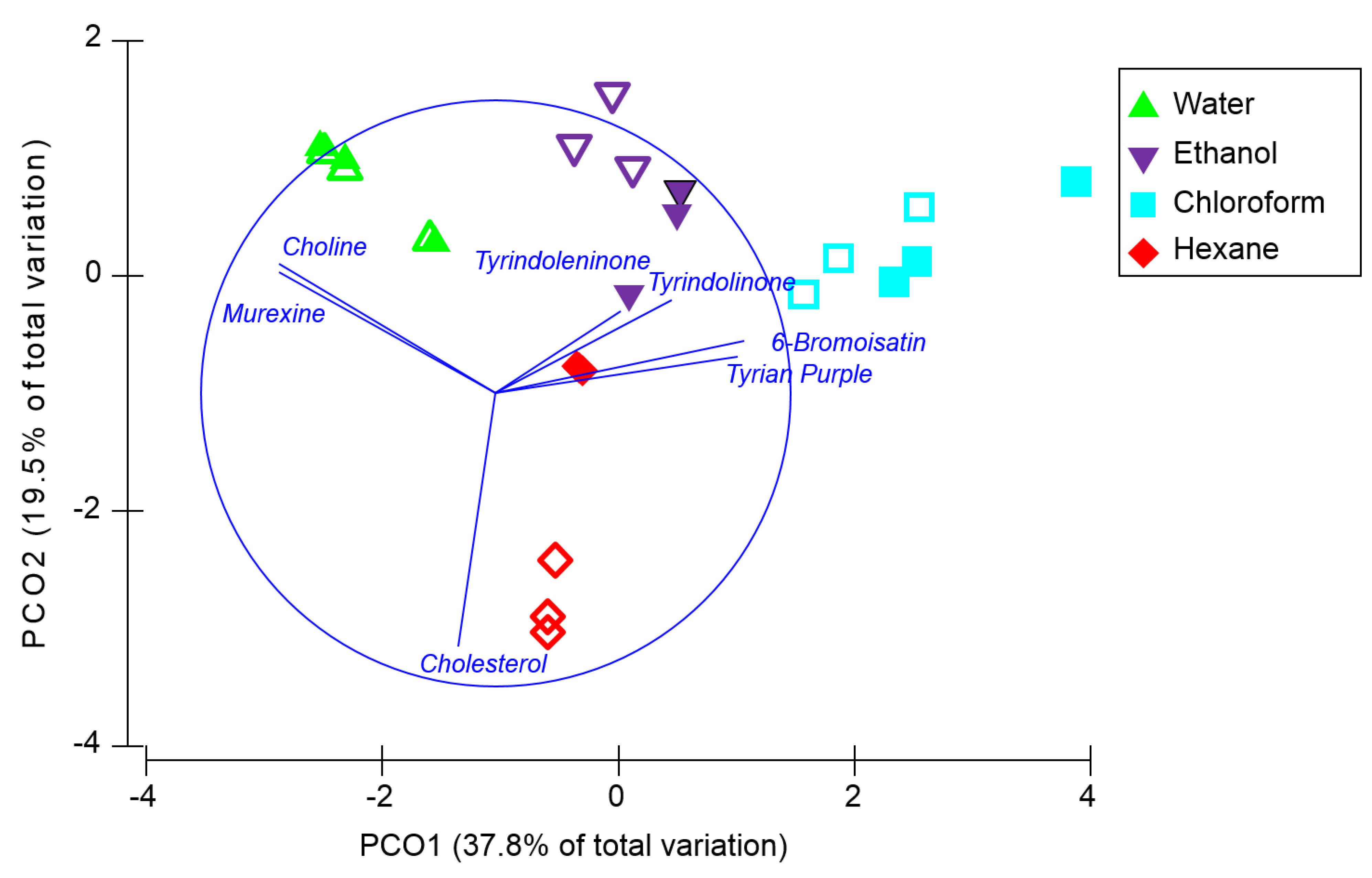 Principal coordinate analysis based on the normalised relative intensities of secondary metabolites detected after solvent separation on NALDI (open symbols) and DIOS (filled symbols) surfaces, grouped according to the type of solvent used (n = 3). Trajectory overlay is based on Pearson correlations (r > 0.3).