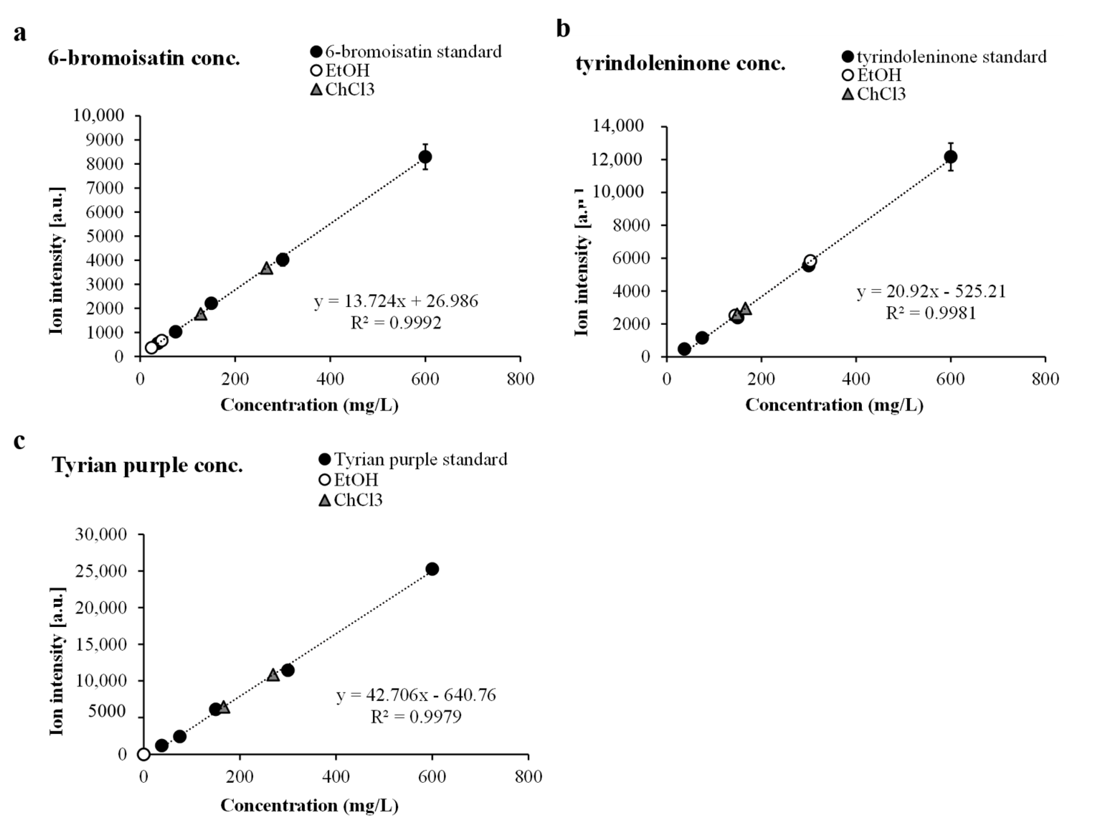 Purified fractions of 6-bromoisatin, tyrindoleninone and Tyrian purple were used effectively to generate standard-curves (Figure 5). This facilitated approximation of metabolite ex situ relative quantification, as the increases in intensity follow linear trends (Figure 5). The ex situ distribution changes across the solvent wash area (Figure 2), so the highest intensity detected for each compound from the summed spectra was selected for comparison to standard curves. Purified 6-bromoisatin dissolved in DMSO at 600, 300, 150, 75 and 37.5 mg/L applied to both NALDI and DIOS surfaces adjacent to solvent separation wash, produced a linear concentration gradient (R2 = 0.9941, Figure 5a). Tyrindoleninone also produced a linear concentration gradient (R2 = 0.959, Figure 5b) when dissolved in DMSO at the same five concentrations. Finally, a purified fraction of Tyrian purple (600, 300, 150, 75 and 37.5 mg/L) gave a linear concentration gradient for LCI-MS signal intensity (R2 = 0.989, Figure 5c).