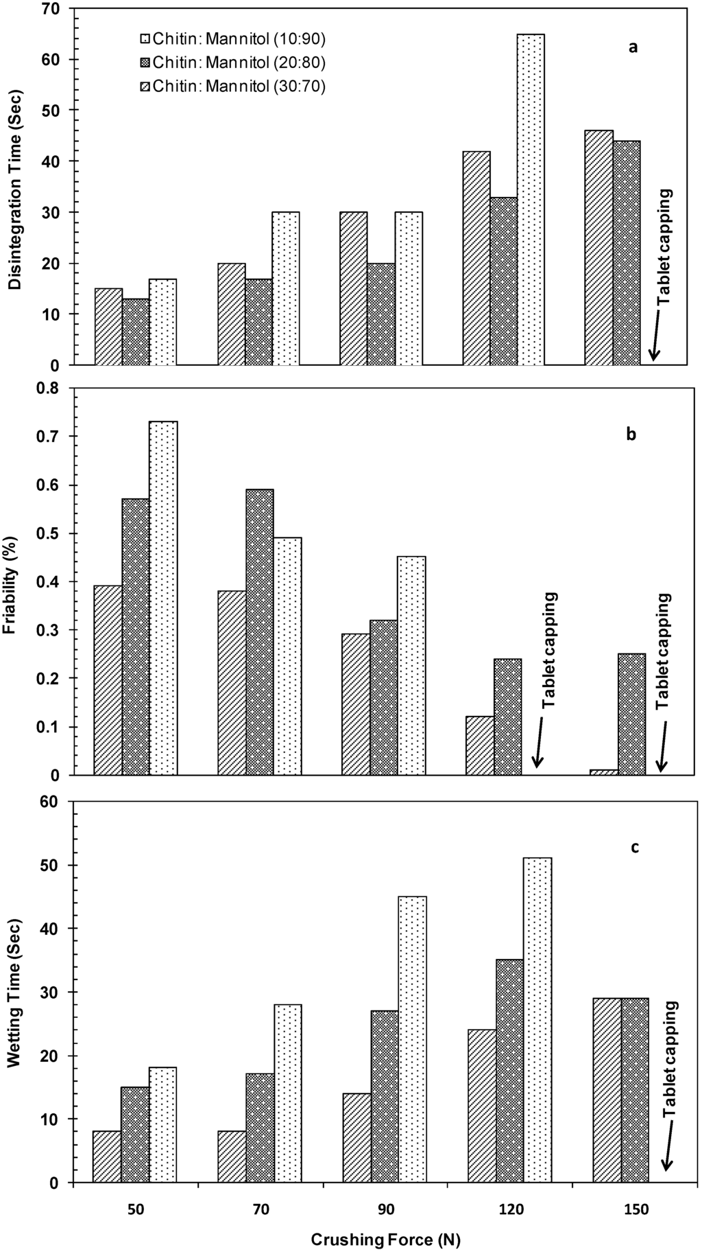 Plots of the crushing force (N) versus (a) disintegration time; (b) friability; and (c) wetting time for compacted mixtures prepared using different ratios of chitin and mannitol (1:9, 2:8, and 3:7 w/w). Tablets were 10 mm in diameter and 250 mg in weight. All powders were lubricated using 1% (w/w) sodium stearyl fumarate.