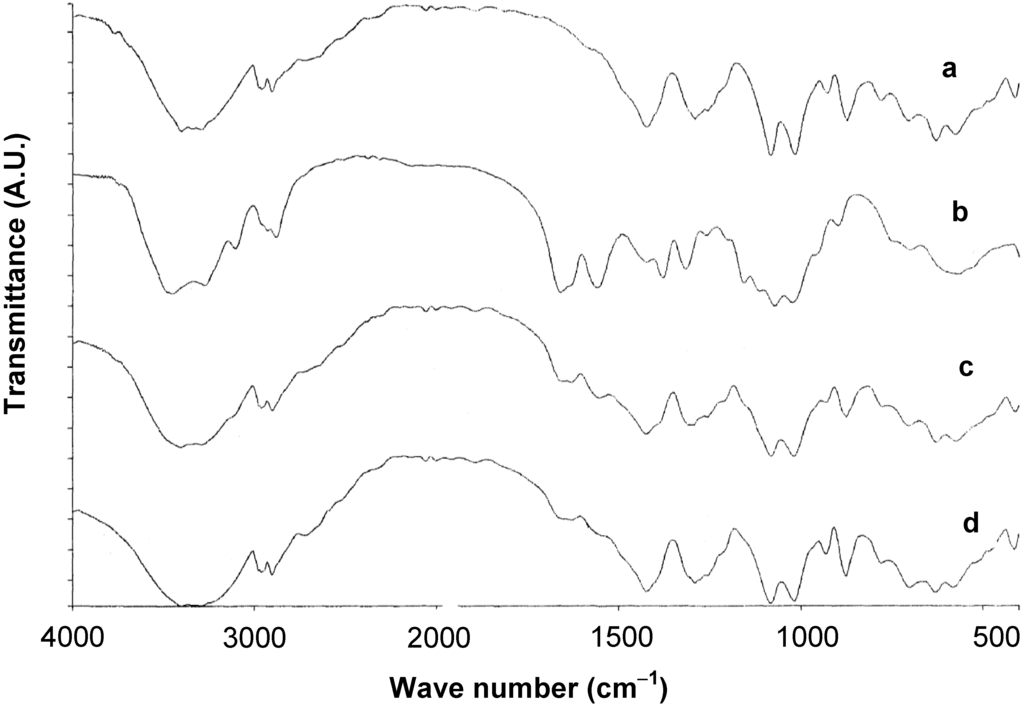 FT-IR spectra of (a) mannitol; (b) chitin; (c) physical mixture of chitin-mannitol (2:8, w/w); and (d) co-processed chitin-mannitol (2:8 w/w) excipient (Cop–CM).