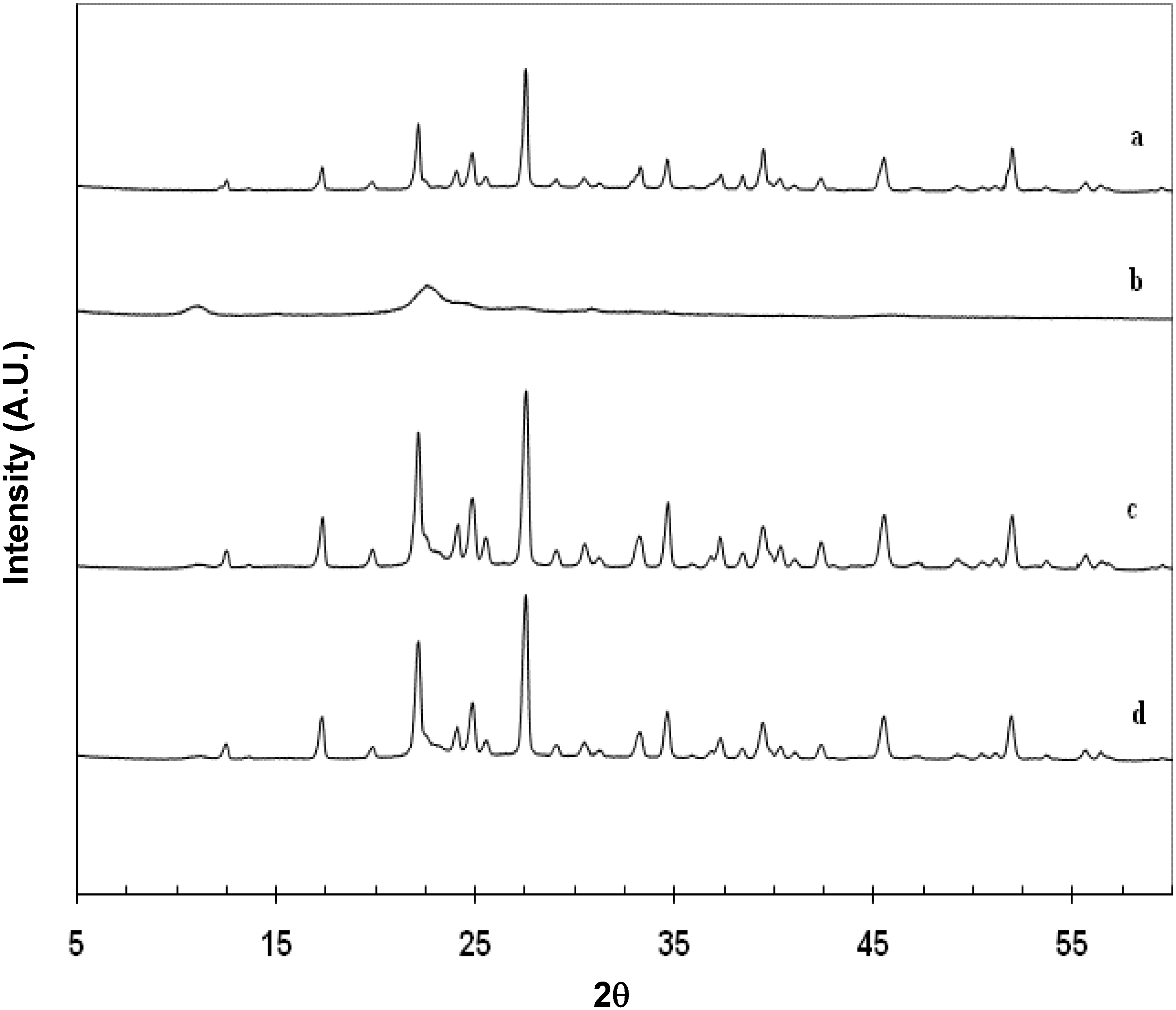 XRPD profiles of (a) mannitol; (b) chitin; (c) physical mixture of chitin-mannitol (2:8, w/w); and (d) co-processed chitin-mannitol (2:8 w/w) excipient (Cop–CM).