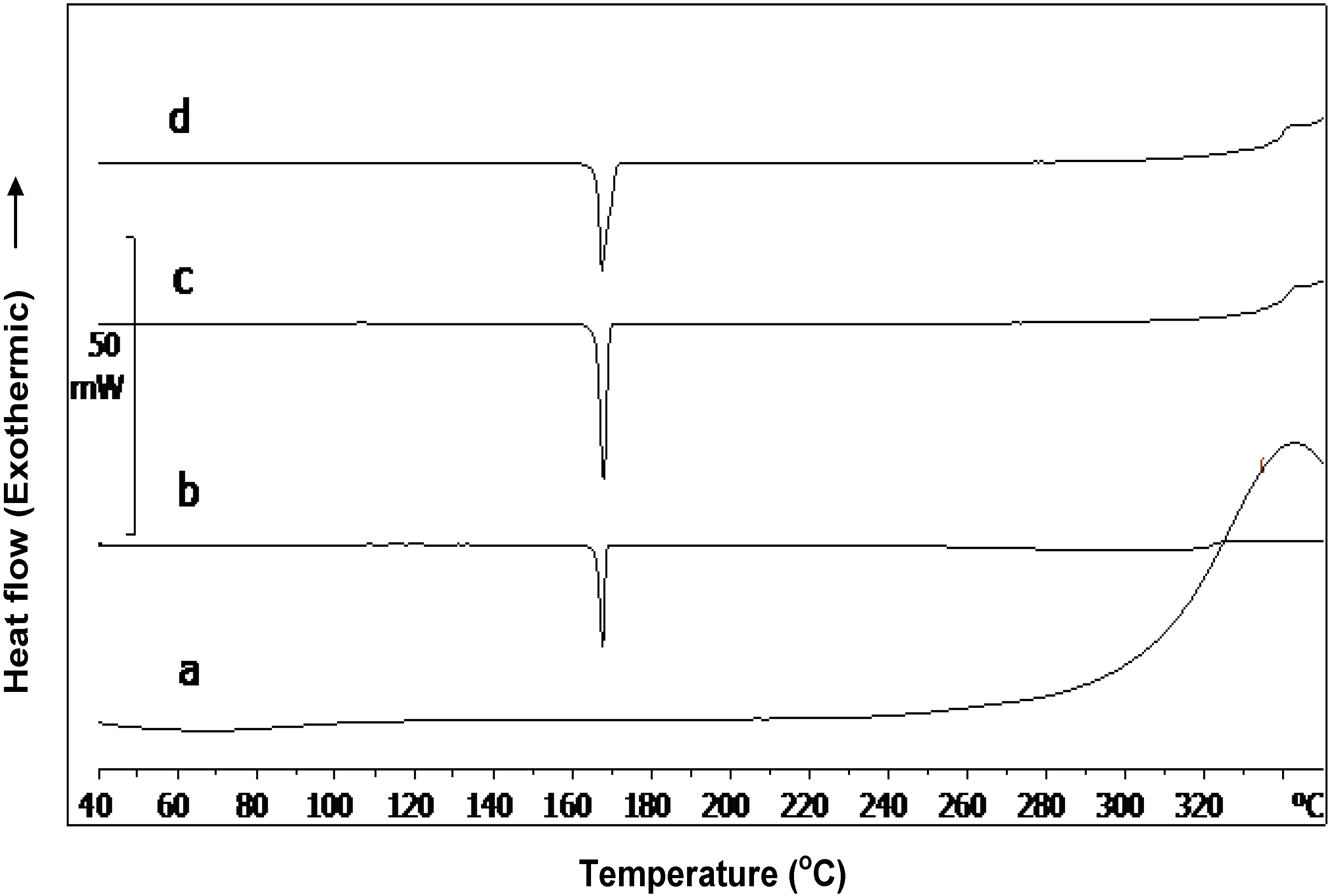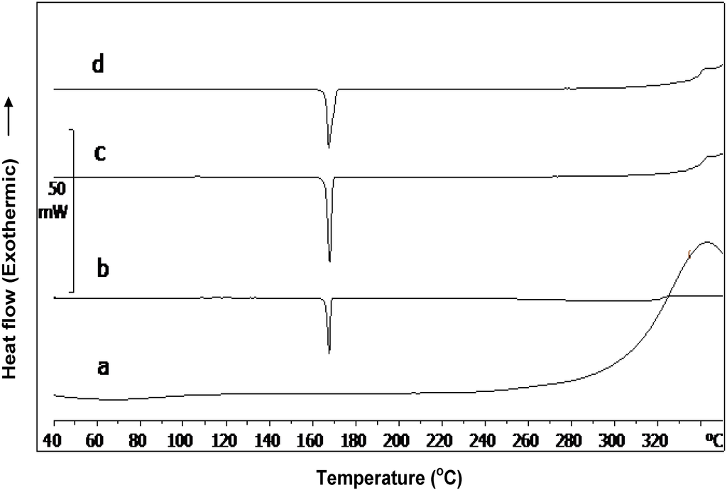 DSC thermograms of (a) chitin; (b) mannitol; (c) physical mixture of chitin-mannitol (2:8, w/w); and (d) co-processed chitin-mannitol (2:8 w/w) excipient (Cop–CM).