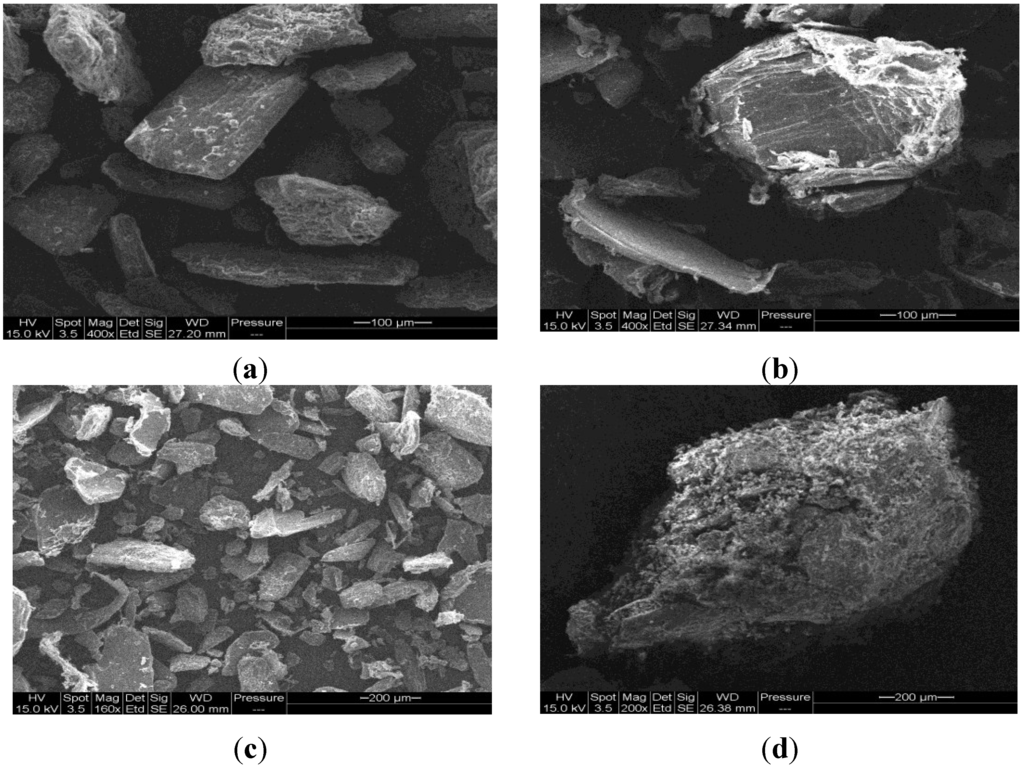 SEM images of (a) mannitol; (b) chitin; (c) physical mixture of chitin-mannitol (2:8, w/w); and (d) co-processed chitin-mannitol (2:8 w/w) excipient (Cop–CM).