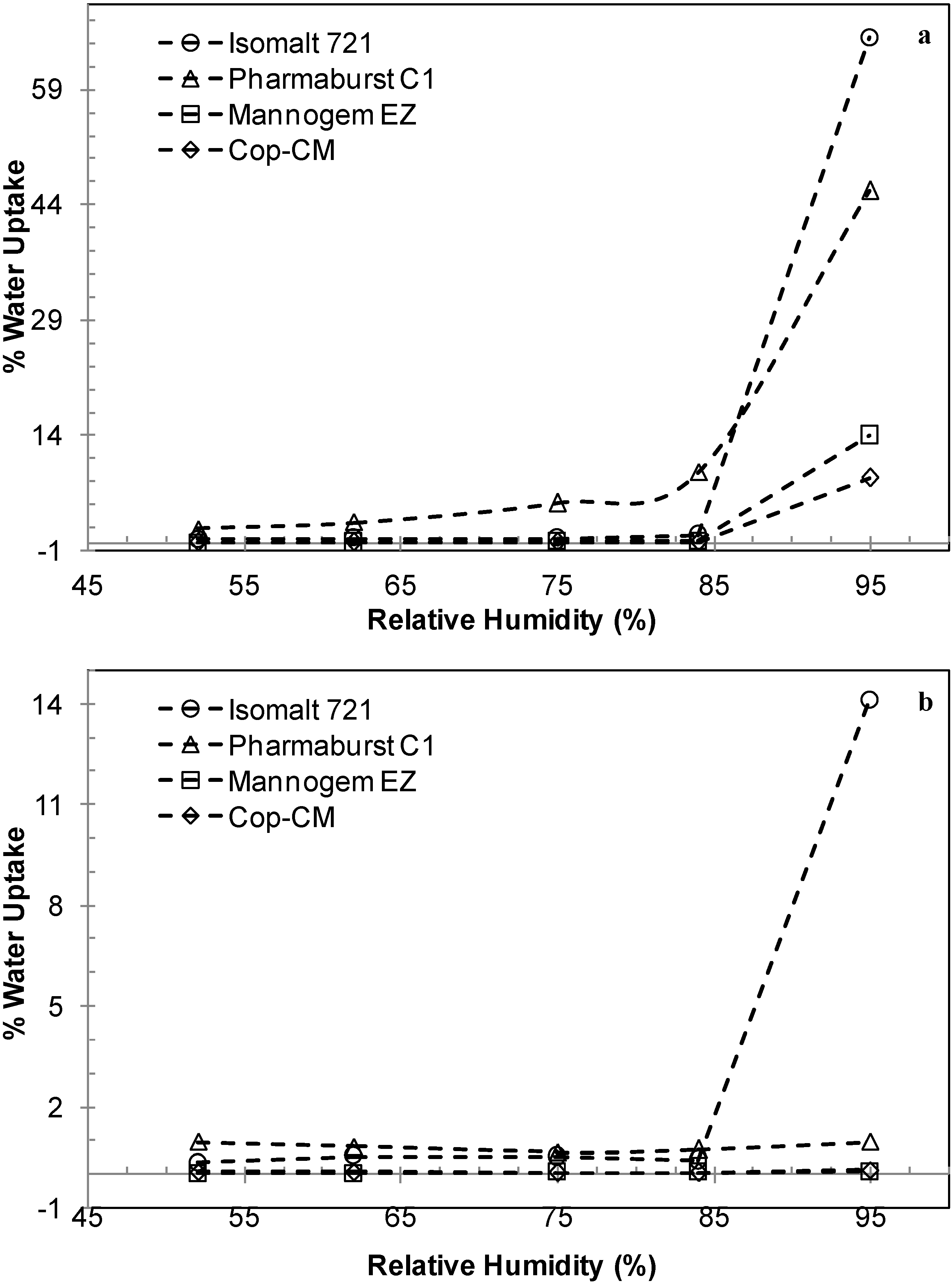 The water uptake by co-processed chitin–mannitol (2:8 w/w) excipient (Cop–CM) in comparison with some commercially available ODT bases after incubation at 25 °C and different relative humidity, (a) for two weeks; and (b) after equilibration at 25 °C/45% relative humidity for one further day.