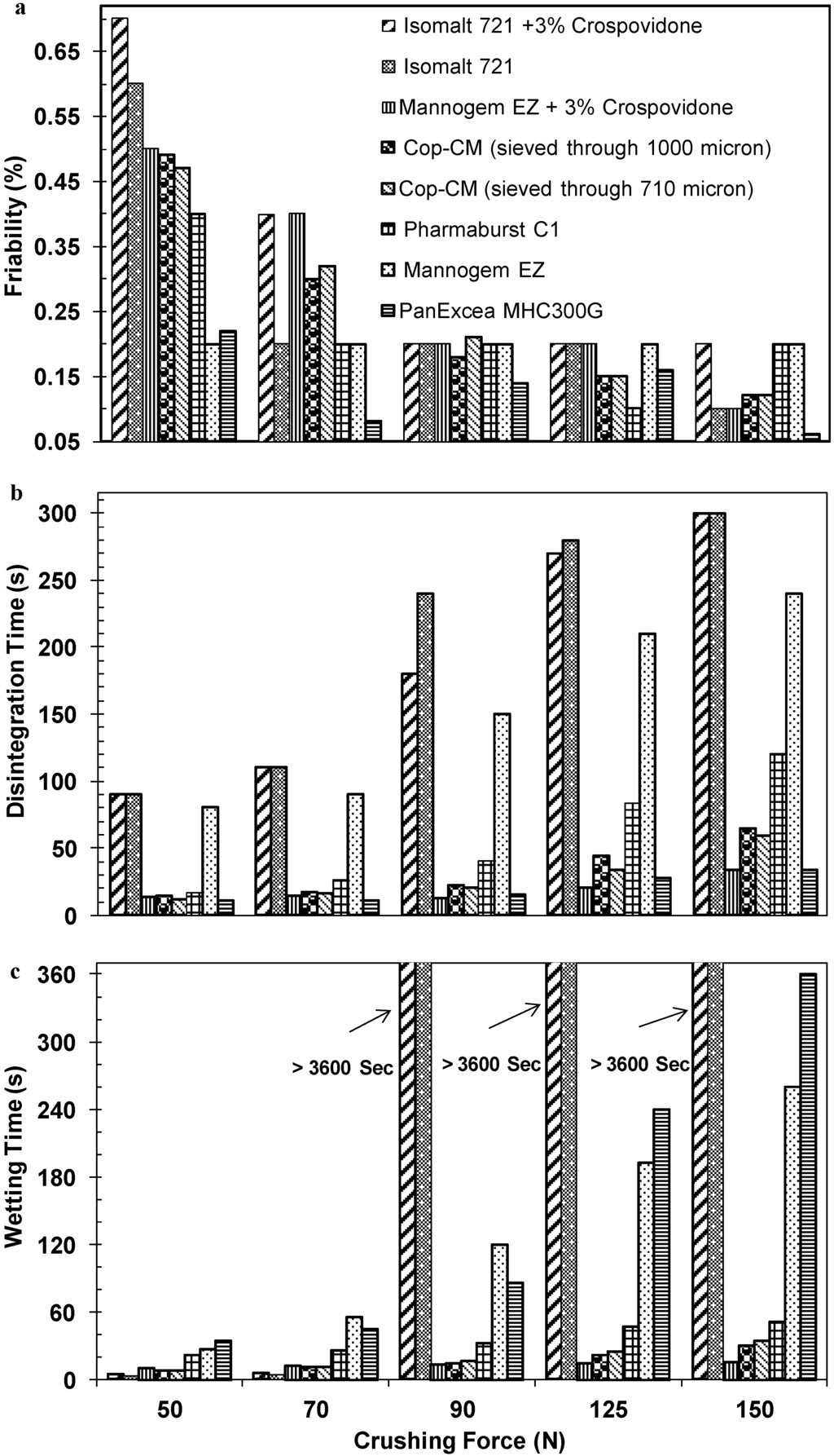 For Cop–CM, it can be clearly observed that increasing the tablet crushing force up to 150 N does not affect both disintegration and wetting times. This property is extremely advantageous where hard tablets with very fast disintegration can be prepared using Cop–CM and simply packed in traditional packaging materials. This prevents the need of a special type of packaging to avoid the breakage of the tablets during removal from the package. A combination of Mannogem™ EZ and 3% crospovidone has showed similar behavior to Cop–CM at high tablets crushing forces. PanExcea MHC300G has preserved the very short disintegration time at 150 N tablet crushing force, while the tablet wetting time was increased. On the other hand, Pharmaburst C1 behaves in a different manner, whereby increasing the tablet crushing force to 150 N the disintegration time was relatively high (>2 min), while the tablet wetting time was not affected.