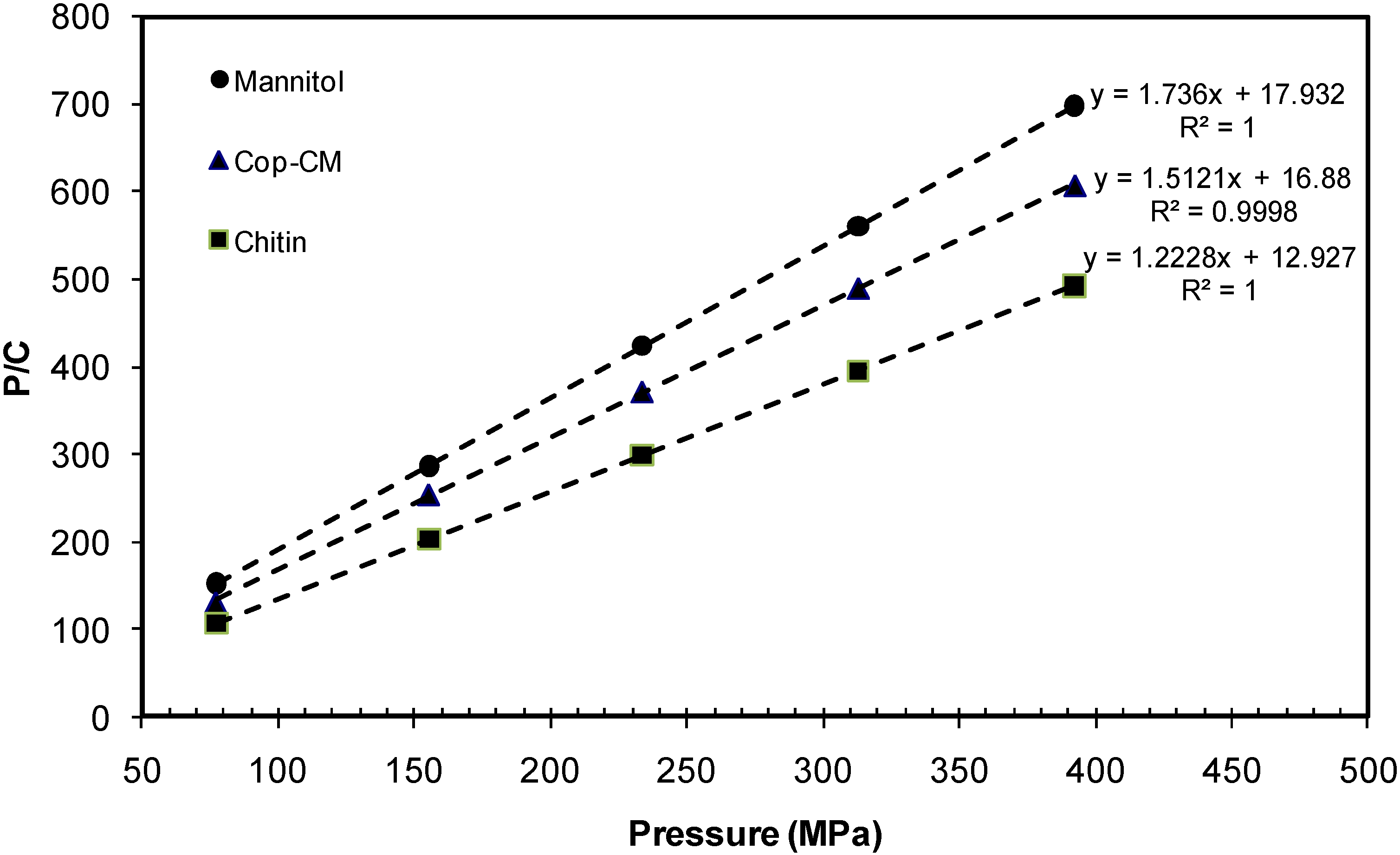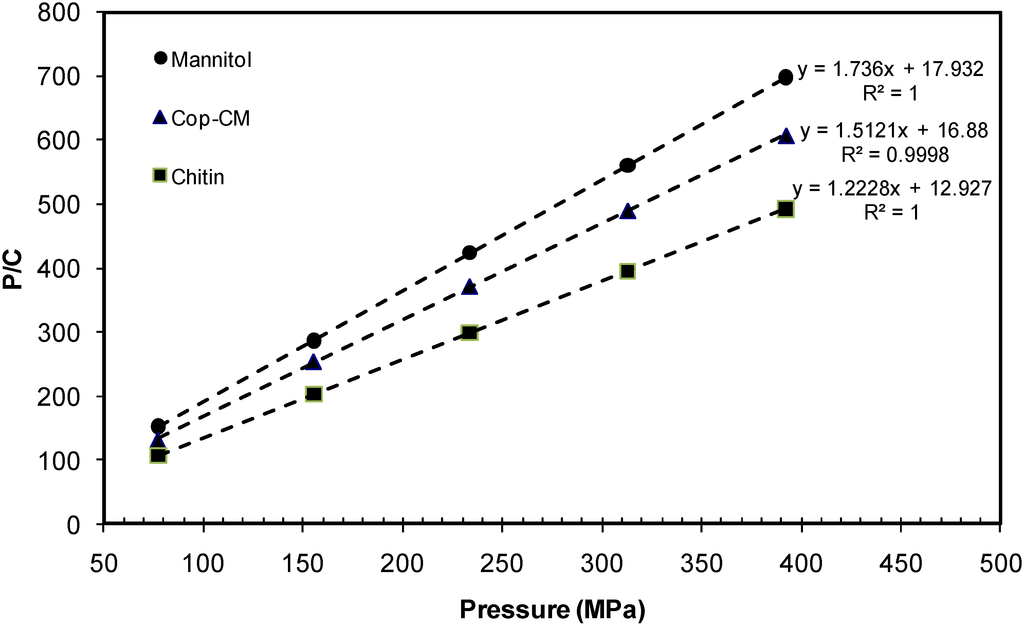Compressibility: Mannitol, chitin and Cop–CM powder samples were compressed using a universal testing machine (RKM 50, PR–F system, ABS Instruments, Tamilnadu, Germany) equipped with 12 mm round, flat face upper and lower punches as well as dies; punch speed was fixed at 10 mm/min. Different compression forces from 80 to 390 MPa were applied. Three tablets were prepared to ensure reproducibility. Compression was carried out at 400 mg tablet weight. The compression behavior of the samples was evaluated using Kawakita analysis [43,44,45,46].