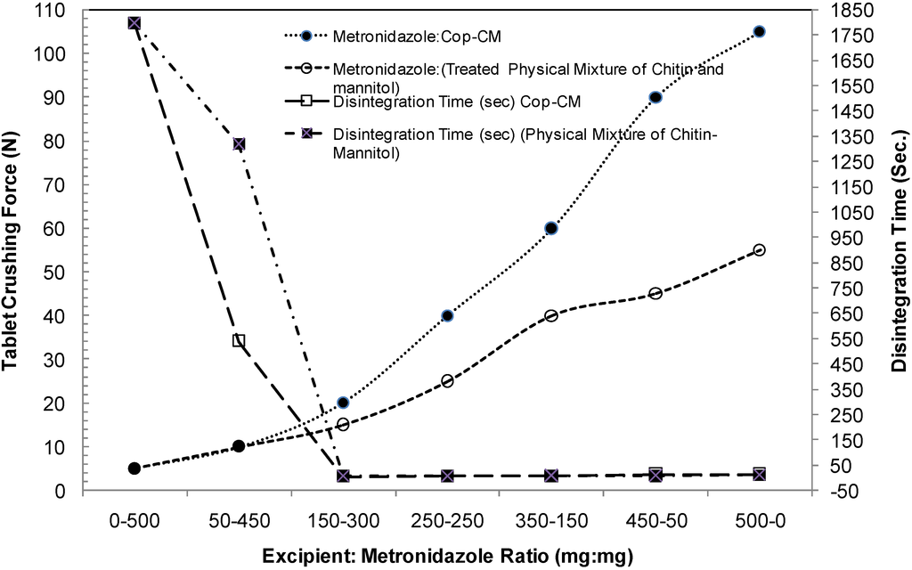 Relationship between tablet crushing force and disintegration time at different Cop–CM: metronidazole ratios using a physical mixture of chitin-mannitol (2:8, w/w) as a reference. Data are represented as the mean of n = 10. Cop–CM represents the co-processed chitin-mannitol (2:8 w/w) excipient.