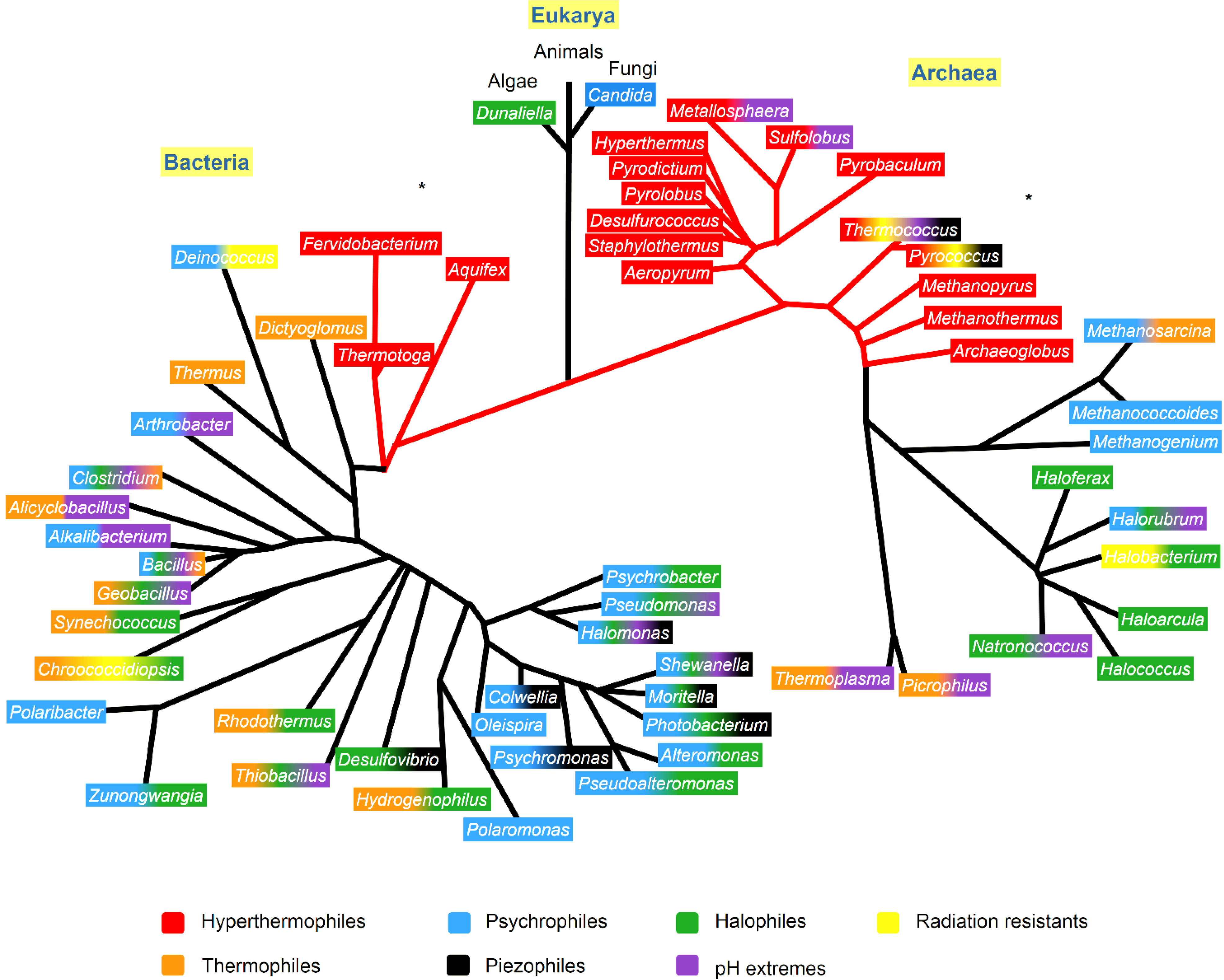 Phylogenetic tree showing the extremophiles and the resistant characteristics that appear in at least one species of each genera, identified with the color code. The phylogenetic tree was based on Woese et al. [28], Lang et al. [29] and Dereeper et al. [30]. The * indicates the phylogenetic branch that were according to Lang et al. [29].