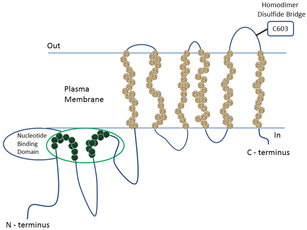 Breast cancer resistance protein (BCRP/ABCG2/MXR/ABCP) is an ATP-dependent efflux transporter, which belongs to the large ATP-binding cassette (ABC) transporter family present on cell membranes, and it is classified into the G subfamily of these transporters [1,2,3,4,5,6]. BCRP, which is a transmembrane protein encoded by the ABCG2 gene, was originally isolated from adriamycin-resistant breast cancer cell lines (MCF-7/AdrVp) [7]. Almost simultaneously, BCRP cDNA sequences were also cloned from mitoxantrone-resistant human cancer cell lines (MXR) [8] and human placenta (ABCP) [9]. BCRP is composed of 655 amino acids (72-kDa) and organized into six transmembrane α-helices, containing only one nucleotide-binding domain (NBD) near its N-terminal and one membrane-spanning domain (MSD) (Figure 1) [1,2,3,4,5,6]. It is one of the smallest human ABC proteins reported so far, which per se is a half transporter that becomes a functional efflux pump when a disulfide bridge at Cys 603 of two proteins is homodimerized. It is important to note that although the minimal functional unit of this transporter is a dimer, higher oligomeric forms (up to homododecamers) have also been reported [1,2,3,4,5,6].