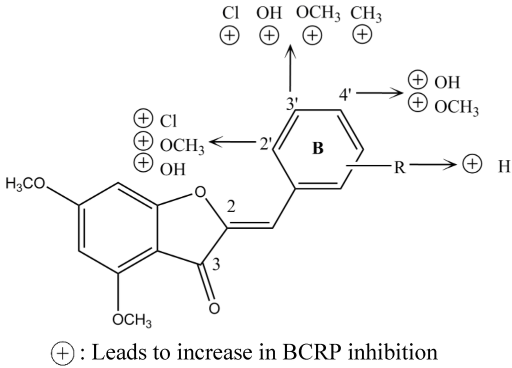 Another study displayed the potential of the 4,6-dimethoxy aurones derivatives as BCRP inhibitors. Aurones were found to re-sensitize BCRP expressing cancer cells to mitoxantrone and showed low antiproliferative activity against cell lines. Structure-activity analysis showed that substitution of ring B had the best P-gp inhibition, with a preference for position 3′ (Figure 4). In contrast, substitution of the benzylidene portion of ring B was less important for the BCRP inhibition, showing a low variation of activity. In conclusion, aurones derivatives with good BCRP inhibitory activity are poor P-gp inhibitors and vice versa [42].