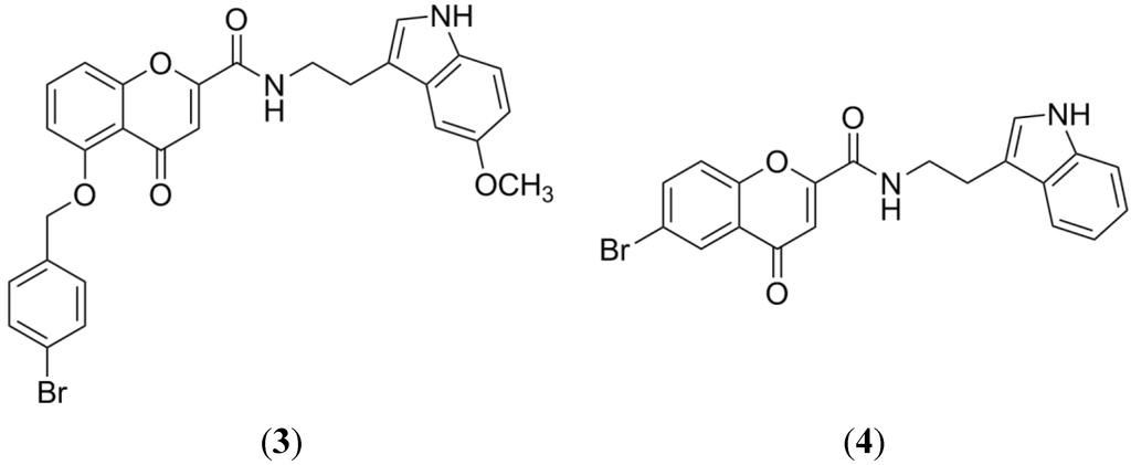 As a final example, we have the chromone type compounds, which have proved to be selective and potent BCRP inhibitors. Boudmendjel, et al. synthesized several benzopyrones derivatives in order to perform a SAR study with this type of compounds [43]. His work demonstrated the impact of the hydrophobic chains, the steric hindrance by bulky groups and the role of methoxy groups (lipophilicity) in the inhibition of BCRP function. Furthermore, a QSAR study with 34 chromones showed that hydrophobicity and shape are key physicochemical parameters to improve the BCRP inhibition, while hydrogen bond donor capacity is an unfavorable feature for this activity [44]. The most potent chromones as BCRP inhibitors resulted from coupling 6-substituted-4-oxo-4H-chromene-2-carboxylic acid with tryptamine, leading to MBL-II-141 (3) and N-(2-(1H-Indol-3-yl)ethyl)-6-bromo-4-oxo-4H-chromene-2-carboxamide (4), (Figure 5) [45,46]. MBL-II-141 led a potent sensitization of ABCG2 positive xenografts to irinotecan through an in vivo ABCG2 inhibition [47]. Compound 4 showed potency, selectivity and very low toxicity in vitro. Therefore this compound is being considered for in vivo evaluation.