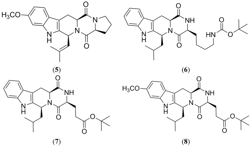 - Cui, C.B.; Kakeya, H.; Okada, G.; Onose, R.; Ubukata, M.; Takahashi, I.; Isono, K.; Osada, H. Tryprostatins A and B, novel mammalian cell cycle inhibitors produced by Aspergillus fumigatus. J. Antibiot. 1995, 48, 1382–1384. [Google Scholar] [CrossRef] [PubMed]
