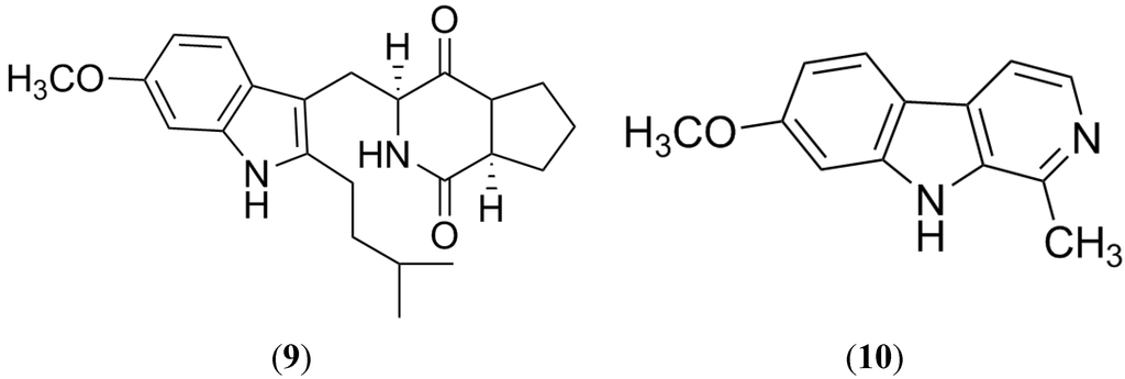 Tryprostatin A (9) is a natural analog of FTC isolated from the marine fungus Aspergillus fumigatus BM939 along with tryprostatin B [66,67,68]. Both molecules are formed by the condensation of a proline unit and an isoprenyl tryptophan residue, leading to a diketopiperazine unit. Both compounds stop cell cycle progression of tsFT210 cancer cells in the G2/M phase [67]. In the experiments to reverse a mitoxantrone-resistant phenotype and inhibit the cellular BCRP-dependent mitoxantrone accumulation using the displayed BCRP-mediated MDR cells EPG85-257RNOV (human gastric carcinoma cell line) and MCF-7/AdrVp (human breast cancer cells), only tryprostatin A (Figure 7) showed activity in a concentration range of 10–50 µM and did not exhibit cytotoxicity at evaluated concentrations [69].