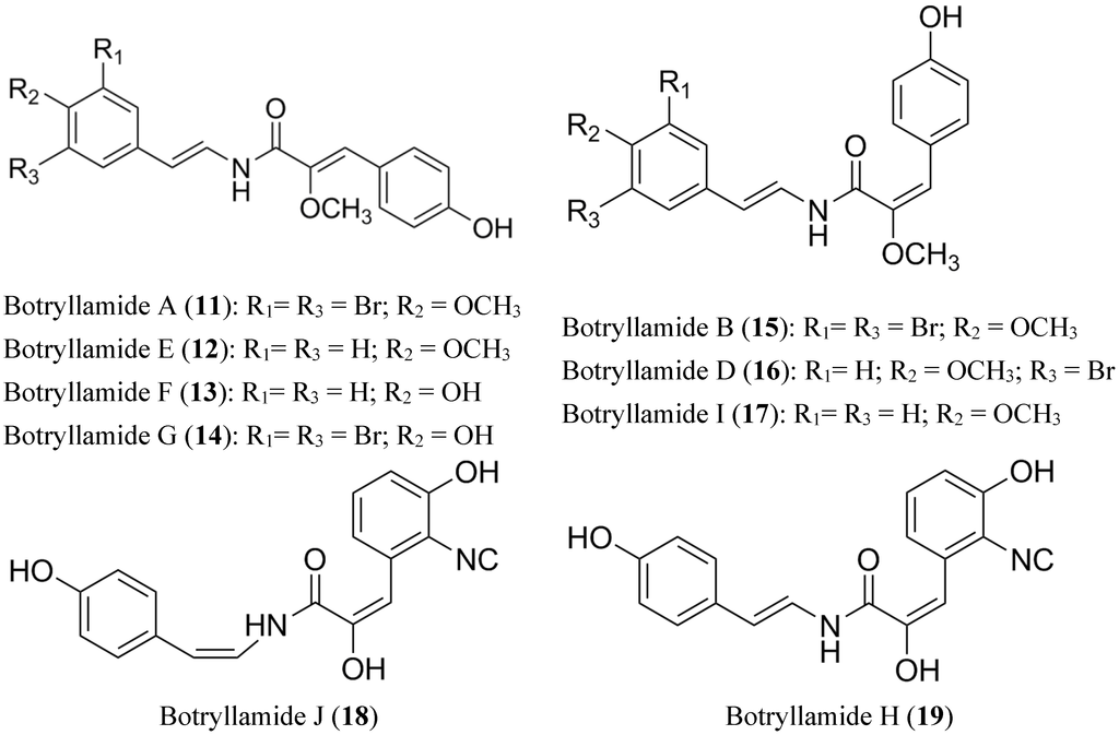 - McDonald, L.A.; Swersey, J.C.; Ireland, C.M.; Carroll, A.R.; Coll, J.C.; Bowden, B.F.; Fairchild, C.R.; Cornell, L. Botryllamides A-D, new brominated tyrosine derivatives from styelid ascidians of the genus Botryllus. Tetrahedron 1995, 51, 5237–5244. [Google Scholar] [CrossRef]