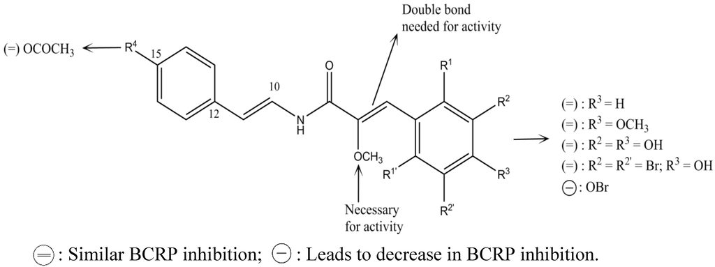 Because of their relatively low cytotoxicity, these compounds could be useful clinically. In addition, a series of botryllamide derivatives, including botryllamide F and G, were achieved in order to establish a possible structural basis for their activity. The BCRP inhibitory activity suggests that the presence of a 2-methoxy-p-coumaric acid moiety conjugated with a double bound is essential; but extended conjugation at C10-C17 (variations in the substituents on the aryl groups) is not crucial (Figure 9). Finally, this SAR study proposed two binding interactions between botryllamides and BCRP [78].