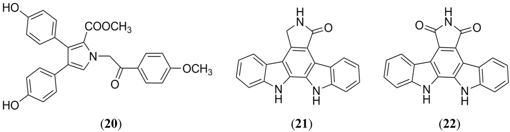 Lamellarins are natural compounds isolated from several marine invertebrates (mainly ascidians and sponges) and are made up of an unusual heterocyclic ring system [79,80,81,82,83,84,85,86,87]. Many of these natural products exhibit some biological activities including antitumoral and anti-HIV activity [79,80,81,82,83,84,85,86,87]. According to the substituted pyrrole, these marine alkaloids are classified into three subgroups: Lamellarins characterized by the presence of the pyrrole ring fused with adjacent aromatic rings (forming a pentacyclic core), a central pyrrole ring unfused to adjacent aromatic rings and a quinoline ring instead of pyrrole [87].