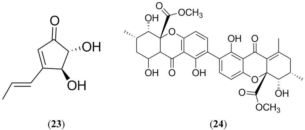 Terrein (23) is a metabolite isolated from some marine strains of Aspergillus terreus (mainly PF-26 and PT06-2) and Emericella variecolor [94,95,96]. Terrein (Figure 11) exhibited interesting properties including antibacterial and antiinflammatory activities, as well as melanogenesis, angiogenin secretion and proteasome inhibition properties [95,96,97,98,99,100,101,102]. Regarding its anticancer properties, 23 displayed strong cytotoxicity (100-fold more potent than paclitaxel) against breast (MCF-7), pancreatic (PANC-1) and liver (HepG2) cancer cells. Terrein also showed a significant reduction in BCRP-expressing cells through the activation of the caspase-7 pathway and the inhibition of the Akt signaling pathway [102].