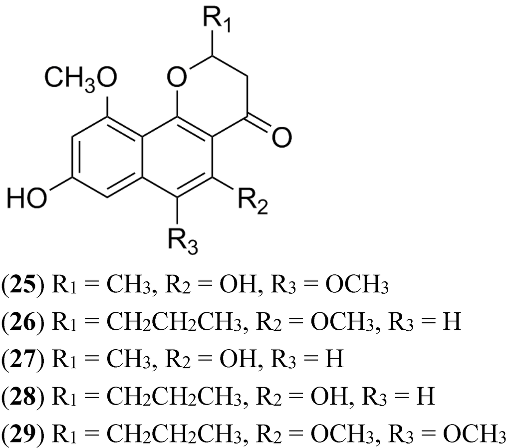 Some organic extracts prepared from marine crinoids Capillaster multiradiatus, Comanthus parvicirrus and a unidentified crinoid of the Comasteridae family, showed activity in a high throughput assay measuring accumulation of the BCRP specific substrate pheophorbide A in BCRP-overexpressing NCI-H460 MX20 cells [109]. Bioassay-guided fractionation of the extracts led to the isolation of five new naphthopyrones along with six known compounds. The isolates were divided into two groups: Linear and angular. This difference in structure was important for the activity against BCRP since only the angular naphthopyrones (25–29) showed significant activity (ranging from 27% to 59%) [109]. Although active naphthopyrones (Figure 12) showed moderate activity against BCRP- overexpressing cells, it is an example for the role of marine natural products as a reservoir of molecules with inhibitory activity of the MDR transporters.