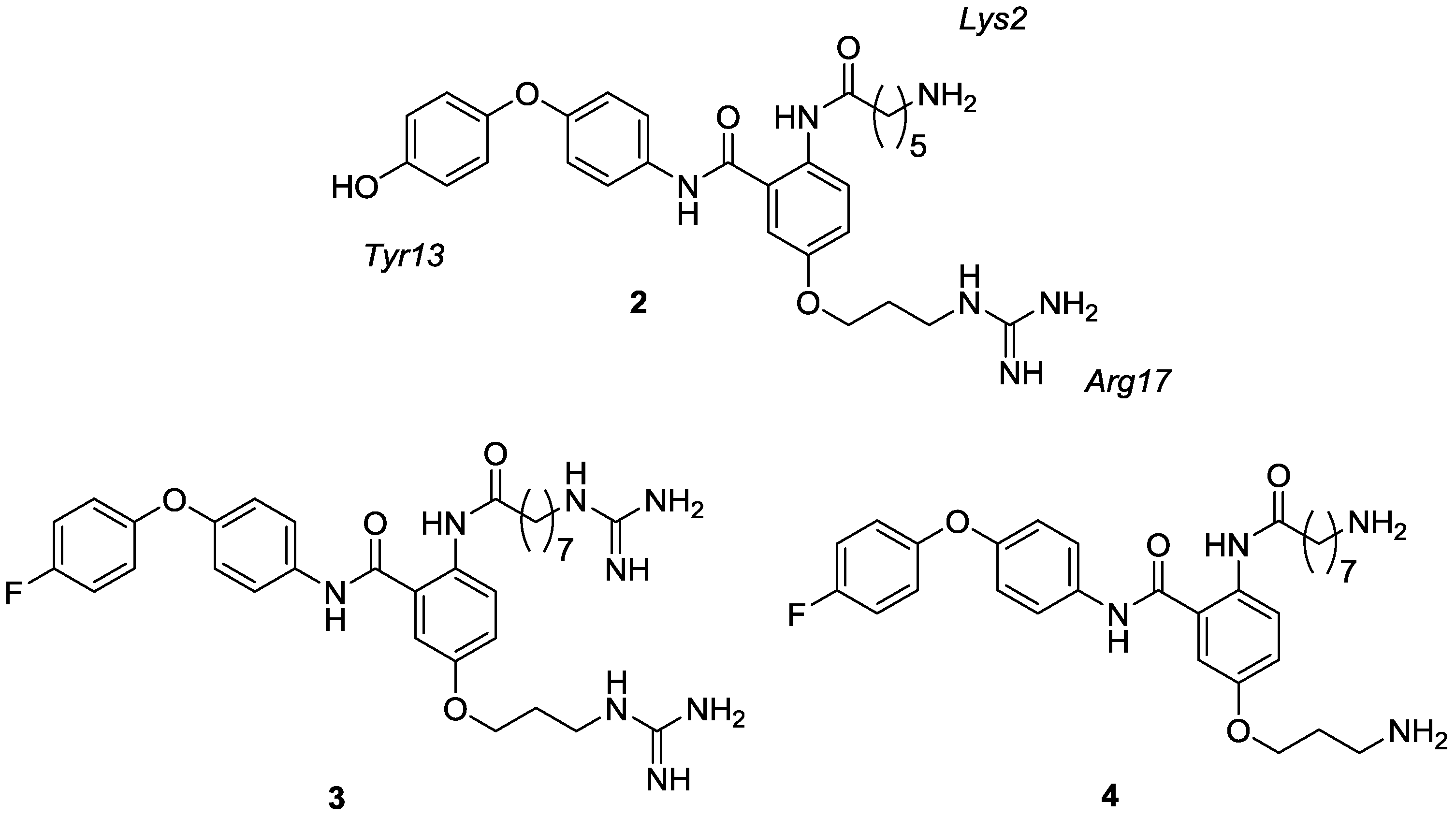 - Andersson, A.; Baell, J.B.; Duggan, P.J.; Graham, J.E.; Lewis, R.J.; Lumsden, N.G.; Tranberg, C.E.; Tuck, K.L.; Yang, A. ω-Conotoxin GVIA mimetics based on an anthranilamide core: Effect of variation in ammonium side chain lengths and incorporation of fluorine. Bioorg. Med. Chem. 2009, 17, 6659–6670. [Google Scholar] [CrossRef] [PubMed]