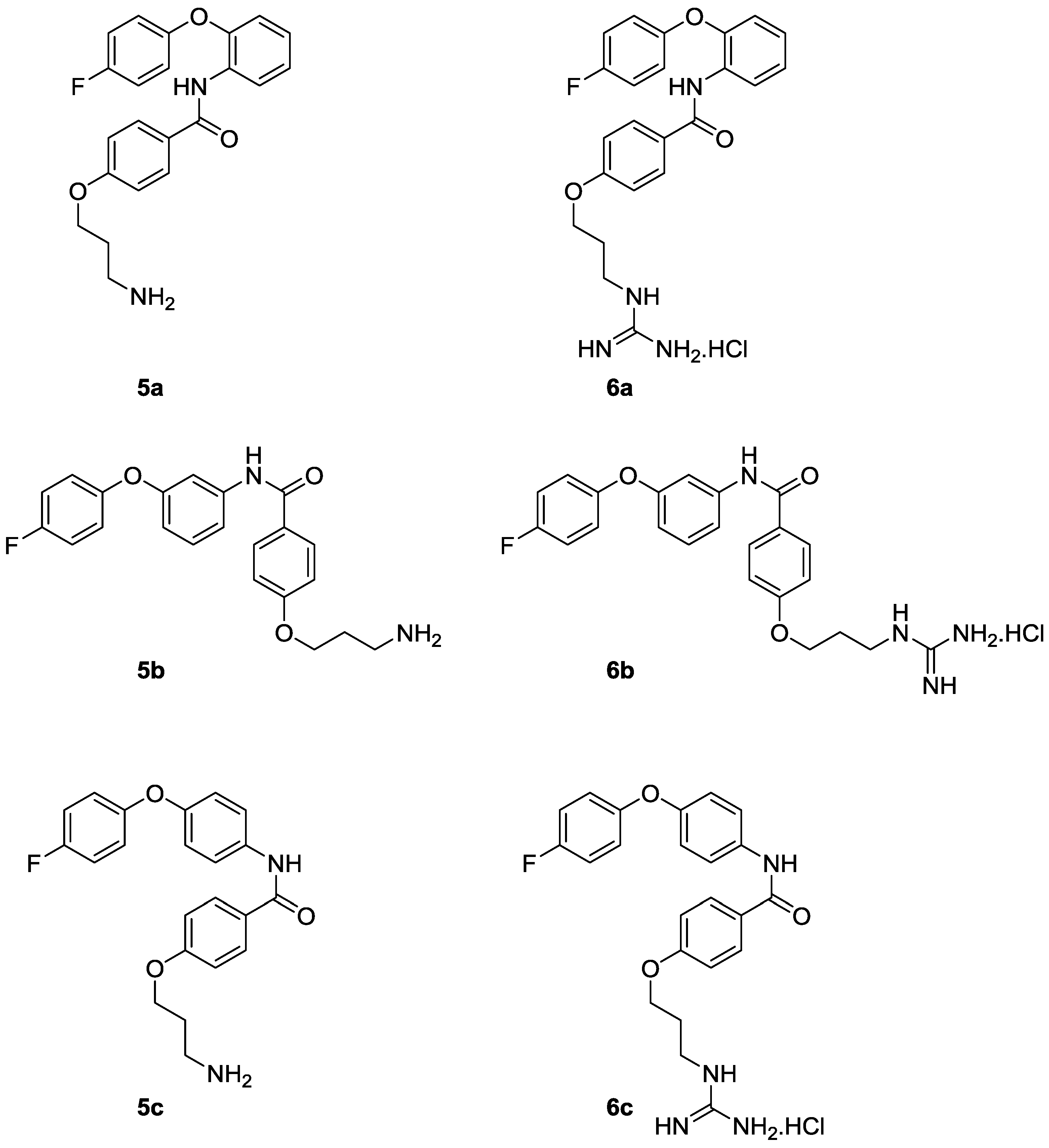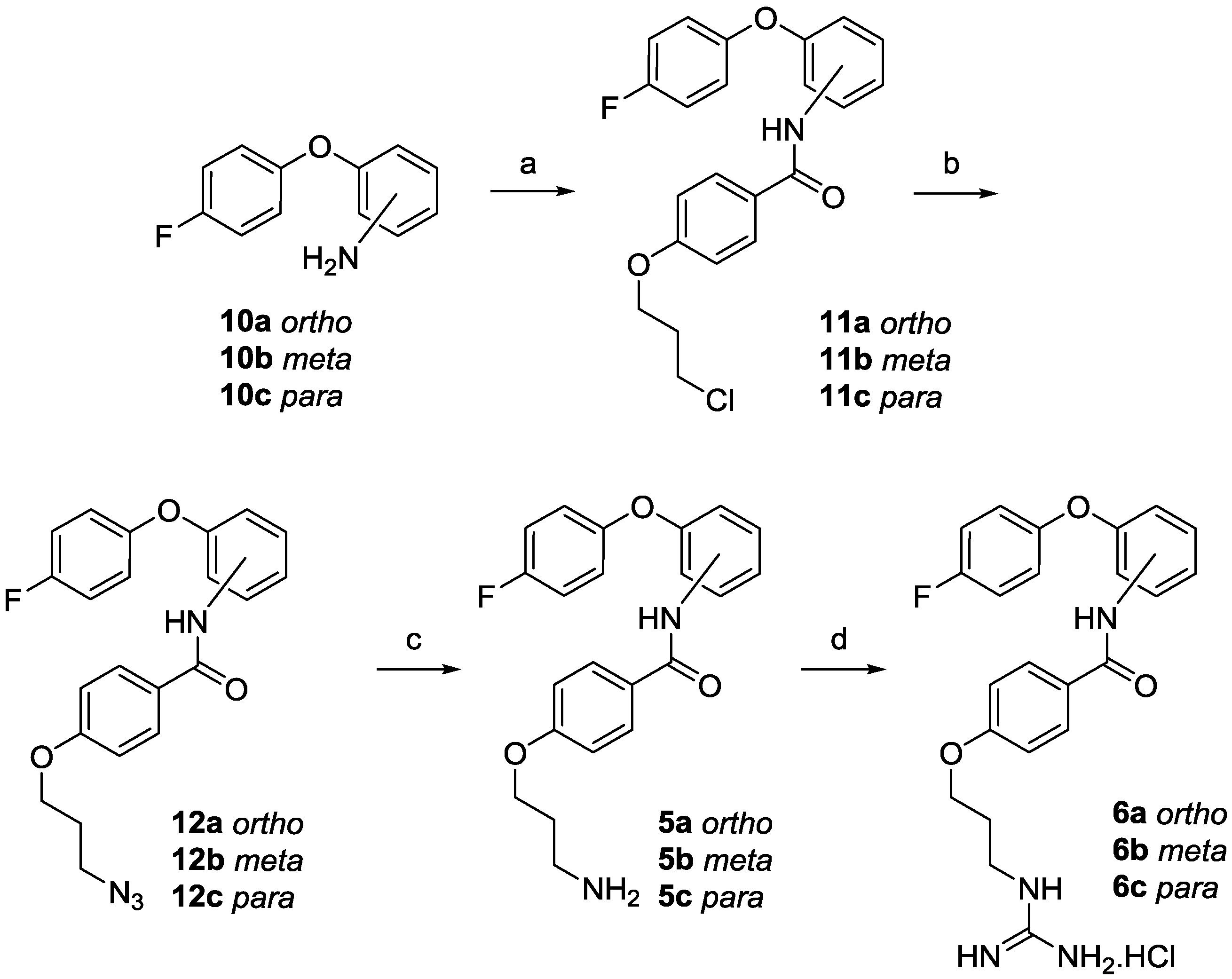 With the required 4-fluorophenoxyanilines (10a–c) in hand, the desired ortho, meta and para amino phenoxy anilides (5a–c) and monoguanidino phenoxy anilides (6a–c) were synthesised, as outlined in Scheme 2. Reaction of the phenoxyl aniline (10a–c) with 4-(3-chloropropoxy)benzoic acid [35,36], using either carbodiimide activation [37] or formation of the acid chloride, gave the desired chloro compounds (11a–c). Subsequent conversion to the azide (12a–c) with sodium azide, followed by a transfer-hydrogenation reaction provided the corresponding amines (5a–c). Treatment of amines (5a–c) with 1H-pyrazole-carboxamidine [38] furnished the phenoxy anilides (6a–c) as hydrochloride salts.