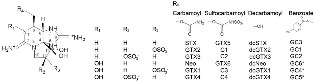 Structure of paralytic shellfish poisoning (PSP) toxins. STX, saxitoxin; GTX, gonyautoxin; Neo, neosaxitoxin; dc, decarbamoyl; GC, G. catenatum toxin. * Theoretical chemical structures of GC4, GC5, and GC6, suggested by [17].