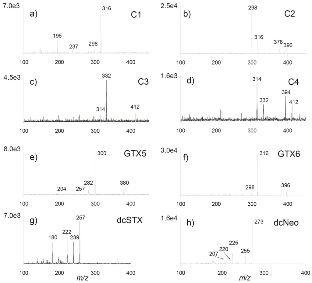 Product ion spectra of paralytic shellfish toxins identified in a Gymnodinium catenatum culture isolated from the Portuguese coast in 2007: (a) m/z 316 of C1; (b) m/z 396 of C2; (c) m/z 412 of C3; (d) m/z 412 of C4; (e) m/z 380 of GTX5; (f) m/z 396 of GTX6; (g) m/z 257 of dcSTX; and (h) m/z 273 of dcNeo. The [M + H]+ ions were selected from full scan analyses and fragmented to achieve the maximum abundance of product ions.