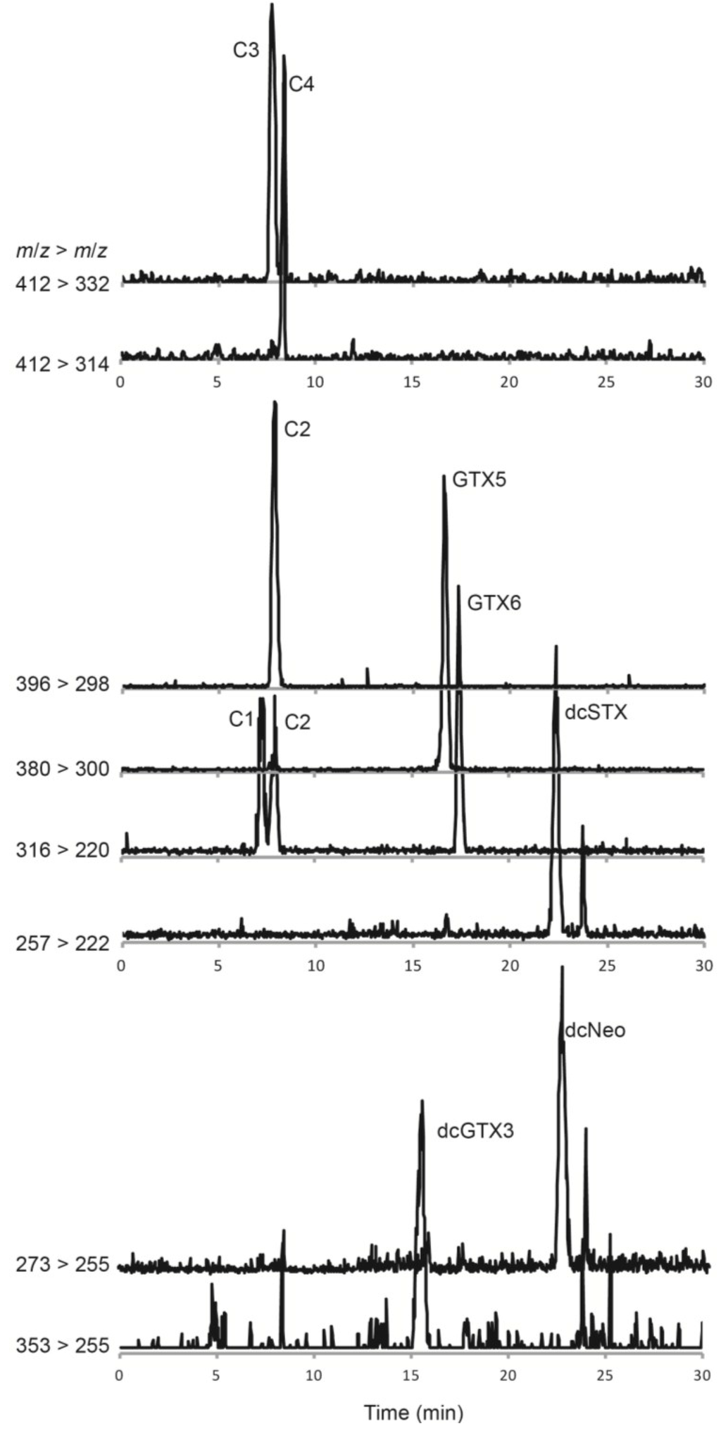 Hydrophilic interaction liquid ion chromatography mass spectrometry analysis of paralytic shellfish toxins in a Gymnodinium catenatum culture isolated from the Portuguese coast in 2007. Multiple reaction monitoring in positive polarity was used to identify toxin derivatives. At least two confirmatory ion transitions were monitored for each paralytic shellfish toxin (PST) derivative. The primary transition ions are shown for all confirmed toxins in the samples: m/z 257 > 222 for dcSTX, m/z 273 > 255 for dcNeo, m/z 316 > 220 for C1 and GTX6, m/z 353 > 255 for dcGTX3, m/z 380 > 300 for GTX5, m/z 396 > 298 for C2, m/z 412 > 314 for C4 and m/z 412 > 332 for C3 (see Table 2 for details on the MS/MS parameters).