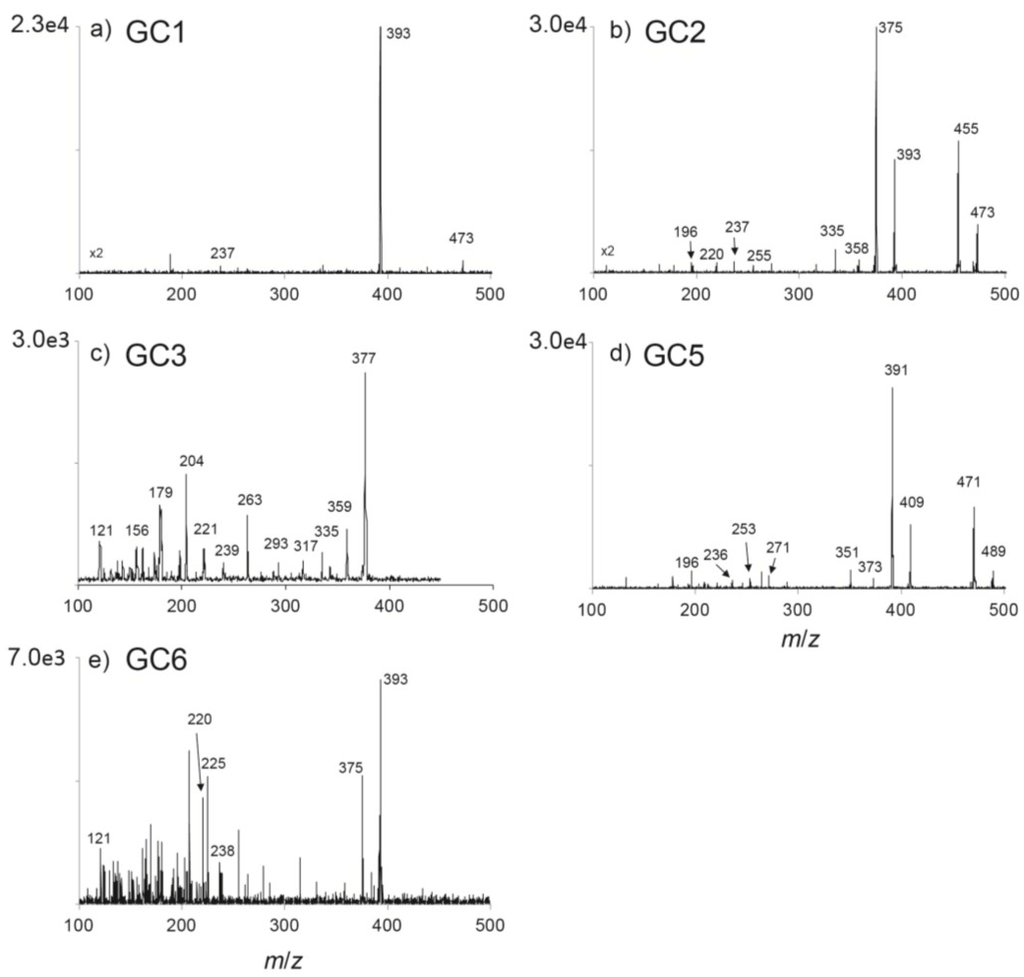 Product ion spectra of GC toxins identified in a Gymnodinium catenatum culture isolated from the Portuguese coast in 2007: (a) m/z 473 of GC1; (b) m/z 473 of GC2; and (c) m/z 377 of GC3; (d) m/z 489 of GC5; and (e) m/z 393 of GC6. The [M + H]+ ions were selected from full scan analyses and fragmented to achieve the maximum abundance of product ions.