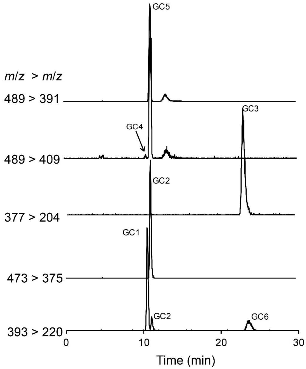 Hydrophilic interaction liquid ion chromatography-mass spectrometry analysis of paralytic shellfish toxins in a Gymnodinium catenatum culture isolated from the Portuguese coast in 2007. Multiple reaction monitoring in positive polarity was used to identify hydroxybenzoate PST analogues GC1–6 that were detected and confirmed in a Gymnodinium catenatum culture isolated from the Portuguese coast. Primary ion transitions are shown: m/z 377 > 204 for GC3; m/z 393 > 220 for GC1 and GC6; m/z 473 > 375 for GC2, m/z 489 > 409 for GC4 and 5, m/z 489 > 391 for GC5 (see Table 2 for details on the MS/MS parameters).
