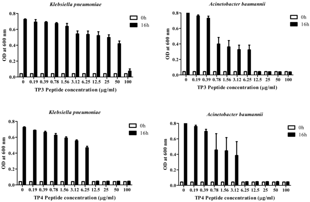 Dose-dependent growth inhibition of clinical isolates of carbapenem-resistant Acinetobacter baumannii (Sk44) and NDM-1-producing Klebsiella pneumonia (NDM-1) by incubation with TP3 or TP4 for 16 h. The data are expressed as means of three replicates. Error bars represent the standard derivation (SD). OD, optical density.