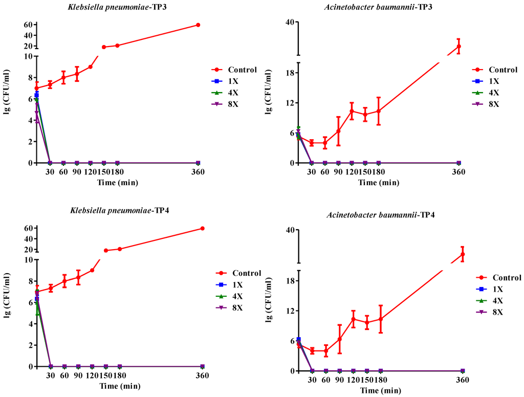 Kill kinetics of TP3 and TP4 against Acinetobacter baumannii (Sk44) and Klebsiella pneumonia (NDM-1). Controls were not treated with peptide. The peptide concentrations were 1 × MIC (1×), 4 × MIC (4×), or 8 × MIC (8×). Experiments were performed in triplicate and the bactericidal activities are presented as mean lg (CFU/mL). Error bars represent the standard deviations.