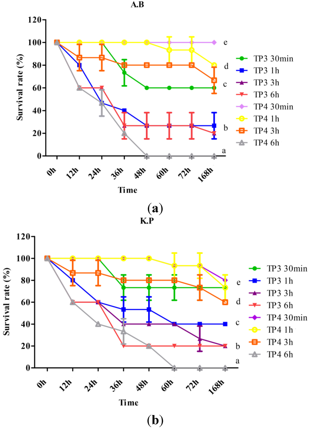 Effects of treatment with TP3 and TP4 on (a) Acinetobacter baumannii (Sk44) (A.B) and (b) Klebsiella pneumonia (NDM-1) (K.P) infection in mice. Mice were injected with bacteria, and TP3 or TP4 were subsequently injected at the indicated times (30 min, 1 h, 3 h, or 6 h) after infection (n = 5 for each group). The survival rate was monitored on a daily basis for up to 168 h. Data represent the means, and error bars represent standard deviations.