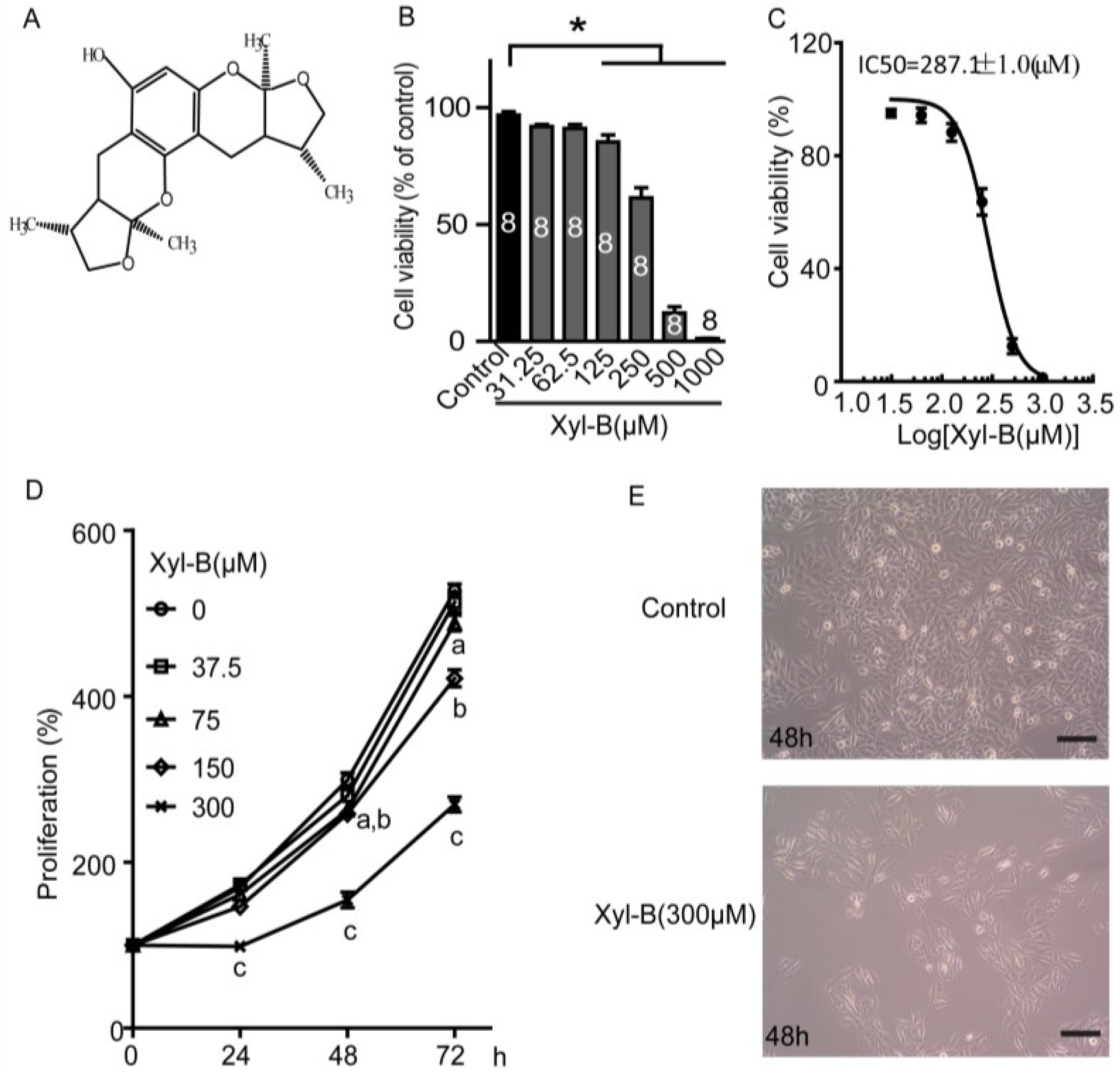 Effects of xyloketal B (Xyl-B) on cell viability and proliferation of U251 cells. (A) Chemical structure of xyloketal B; (B) Xyloketal B concentration-dependently reduced the cell viability of U251 cell line. U251 cells were incubated with xyloketal B (31.25–1000 μM) for 24 h, following MTT assay. * p < 0.05, n = 8 independent experiments; (C) Nonlinear curve fit for dose-response of xyloketal B treatment in U251 cells for 24 h. IC50 = 287.1 ± 1.0 μM; (D) Xyloketal B inhibited proliferation of U251 cell line. U251 cells were treated with xyloketal B for 24, 48, and 72 h, and then cell proliferation was detected by MTT assay; a, b, and c represent 75, 150, and 300 μm xyloketal B versus the control group, respectively, p < 0.05, n = 6 independent experiments; (E) Representative images of U251 cells with or without xyloketal B treatment for 48 h showed reduction of cell numbers in xyloketal B treatment group. Cell images were obtained with a digital camera connected to a phase-contrast Olympus microscope (CKX41, ×10 objectives). n = 3; (F) Xyloketal B inhibited colony formation of U251 cells. Cells were plated in six-well culture plates and treated with xyloketal B (300 μM) for 24 h. The culture medium was changed at regular time intervals. Colony formation of U251 cells was detected by crystal violet staining at seven days after xyloketal B treatment. Images were taken using a scanner (CanoScan LiDE 700F, left panel) and a digital camera connected to a phase-contrast Olympus microscope (CKX41, ×10 objectives, right panel). Colony numbers were calculated using Image-Pro Plus software. Representative images were shown. n = 3; (G) Statistic analysis of colony formation results. Xyloketal B significantly reduced the colony formation of the U251 cells. * p < 0.05, n = 3. All scale bars = 150 μm.