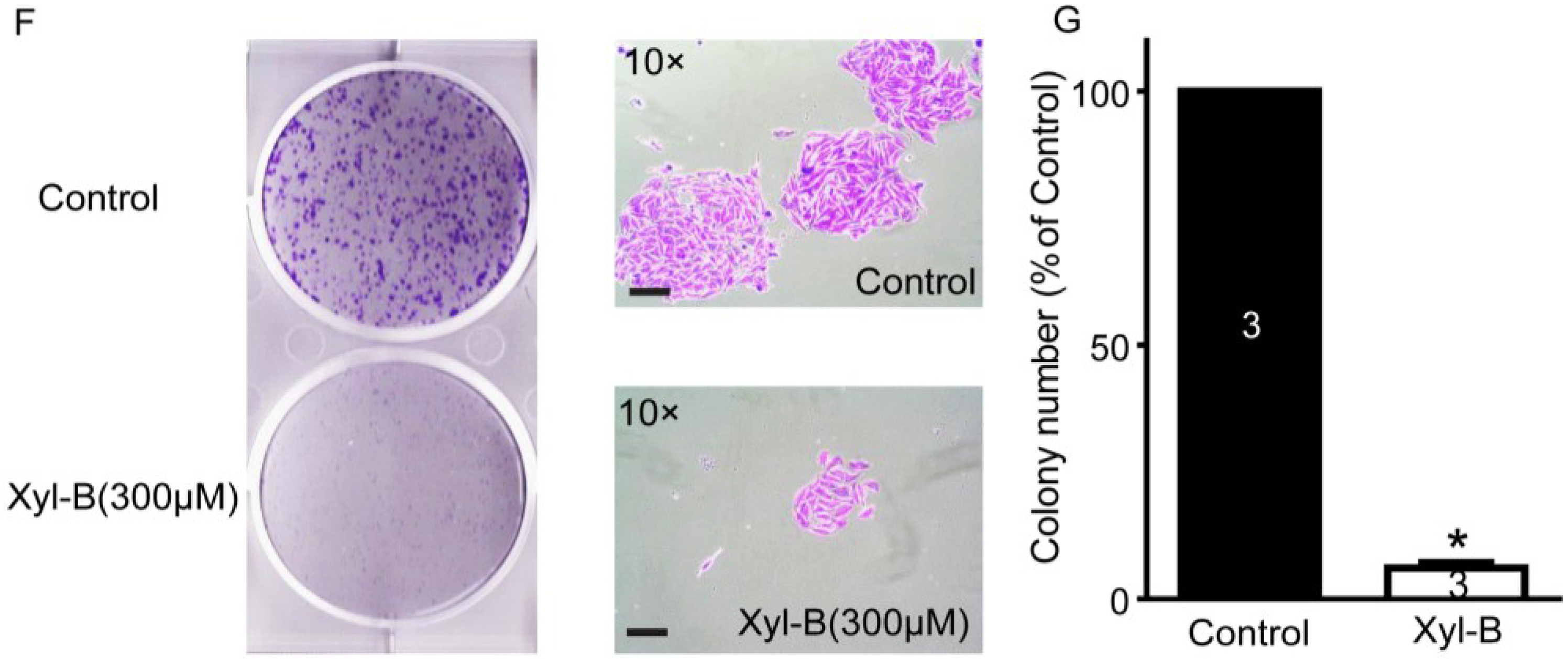 Next, cell proliferation was detected using MTT assay [21]. The number of living cells is proportional to the OD value of MTT assay. U251 cells were incubated with 37.5–300 μM xyloketal B for 24, 48, and 72 h before MTT assay was carried out. The OD values of MTT assay were detected once U251 cells were treated with various concentration of xyloketal B and set as a baseline of cell proliferation (100%). As shown in Figure 1D, xyloketal B treatment for 24 h inhibited U251 cell proliferation at 300 μM, showing 98.5% ± 5.9% of baseline in xyloketal B (300 μM) and 169.4% ± 1.9% of baseline in control group (p < 0.05, n = 6). When U251 cells were incubated with xyloketal B for 48 and 72 h, cell proliferation was significantly inhibited by xyloketal B at lower concentrations up to 75 μM (p < 0.05, n = 6). These data indicate that the inhibitive effects of xyloketal B on cell proliferation are time- and concentration-dependent. In addition, xyloketal B (<300 μM) mainly displayed inhibition of cell proliferation, rather than producing cytotoxic effects on the U251 cells. Cell images were also taken at 48 h after treatment with xyloketal B (300 μM), and showed no significant cell damage, but displayed a decreasing cell density compared to the control group, which had a higher cell density in the visual field (Figure 1E, n = 3). In vitro colony formation assay, which is a cell survival assay, evaluates the ability of a single cell to grow into a colony and also is used to assess the long-term effects on cell proliferation [26]. As shown in Figure 1F,G, a large number of U251 cell colonies was seen in the control group after seeding in six-well plates for seven days with crystal violet staining. The colony formation of U251 cells was significantly decreased after the xyloketal B (300 μM) treatment to 6.1% ± 1.1% of the control (* p < 0.05, n = 3). The results of colony formation assay further demonstrated the inhibitive effects of xyloketal B on U251 cell proliferation.