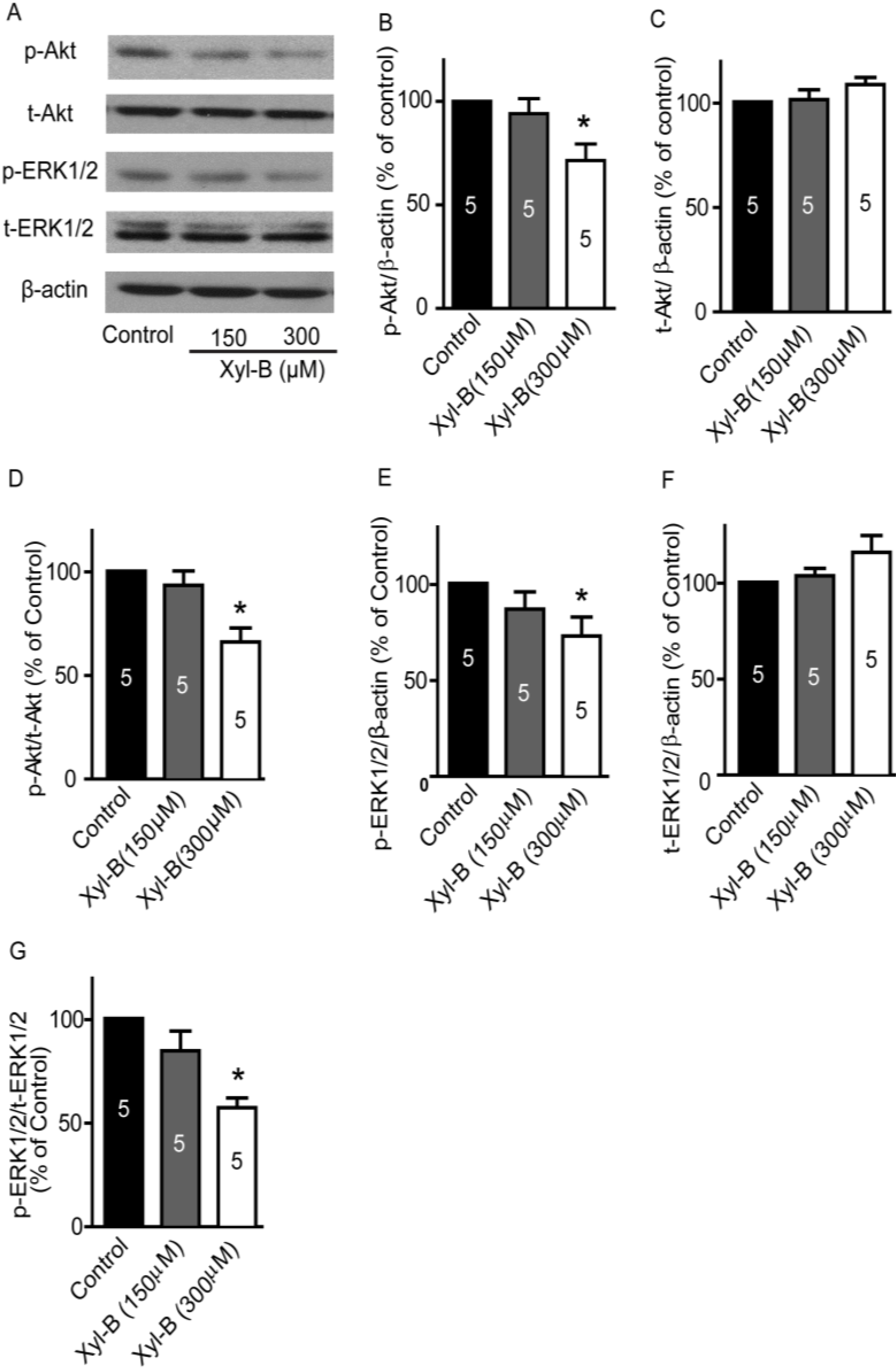 Effects of xyloketal B on p-ERK, t-ERK, p-Akt, and t-Akt protein expressions. U251 cells were treated with xyloketal B (150 and 300 μM) for 24 h, and then the protein expression profile was detected by western blots. (A) Representative images of western blotting results; (B) Xyloketal B (300 μM) treatment significantly reduced p-Akt protein expression. * p < 0.05, n = 5; (C) Xyloketal B did not significantly alter the t-Akt protein expression; (D) Ratio of p-Akt/t-Akt decreased in the xyloketal B (300 μM) treatment group. * p < 0.05, n = 5; (E) Xyloketal B (300 μM) treatment significantly reduced p-ERK1/2 protein expression. * p < 0.05, n = 5; (F) Xyloketal B did not significantly alter t-ERK1/2 protein expression; (G) Ratio of p-ERK1/2/t-ERK1/2 decreased in xyloketal B (300 μM) treatment group. * p < 0.05, n = 5.