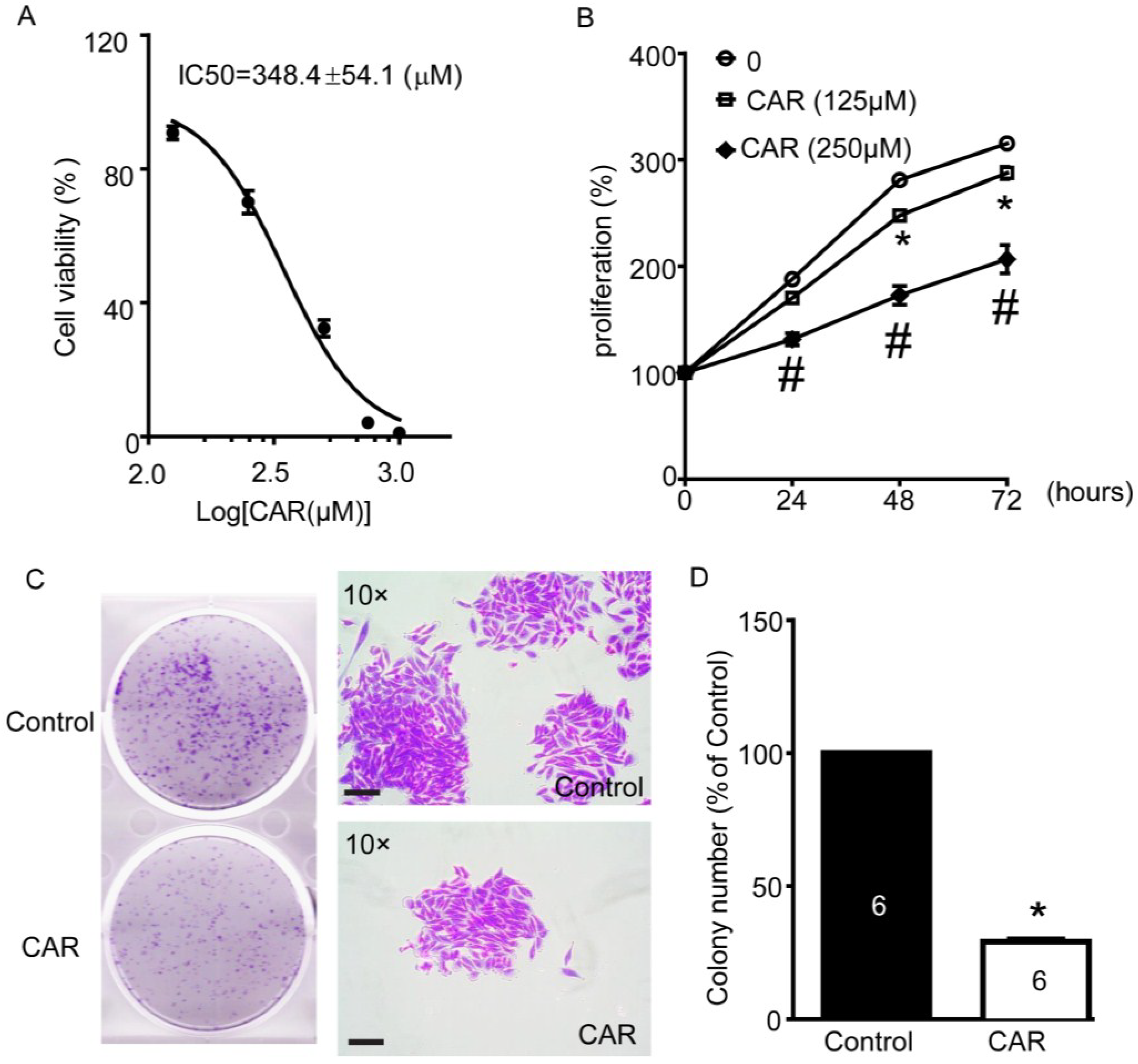 Effects of TRPM7 inhibitor carvacrol (CAR) on viability, proliferation, and migration of U251 cells. (A) Carvacrol reduced the viability of U251 cells. U251 cells were treated with various concentrations of carvacrol for 24 h following detection with MTT assay. Nonlinear curve fitting for dose-response of carvacrol treatment was displayed and IC50 was calculated as 348.4 ± 54.1 μM. n = 8 independent experiments; (B) Carvacrol inhibited the proliferation of U251 cells. U251 cells were treated with carvacrol (125 and 250 μM) or vehicle control (0.1% DMSO) for 24, 48, or 72 h. Cell proliferation was measured using MTT assay. * p < 0.05, carvacrol (125 μM) group versus control group; # p < 0.05, cavarcrol (250 μM) group versus control group, n = 8 independent experiments; (C) Carvacrol inhibited colony formation of U251 cells. Cells were plated in six-well culture plates and treated with carvacrol (500 μM) for 24 h. Colony formation of U251 cells was detected by crystal violet staining at seven days after carvacrol treatment. Images were taken using a scanner (CanoScan LiDE 700F, left panel) and a digital camera connected to a phase-contrast Olympus microscope (CKX41, ×10 objectives, right panel). Colony numbers were calculated using Image-Pro Plus software. Representative images were shown. n = 6; (D) Statistic analysis of colony formation results. Carvacrol B significantly reduced the colony formation of the U251 cells. * p < 0.05, n = 6; (E) Carvacrol inhibited U251 cell migration. The representative images of wound healing were displayed. After being scratched with 200-μL pipette tip, U251 cells were treated with carvacrol (500 μM) or vehicle (0.1% DMSO), then images were taken at 0, 24, and 48 h and gap closure was analyzed; (F) Statistical analysis of migration results. Carvacrol significantly inhibited the cell migration of the U251 cells at 48 h timeline. * p < 0.05, n = 4. All scale bars = 150 μM.