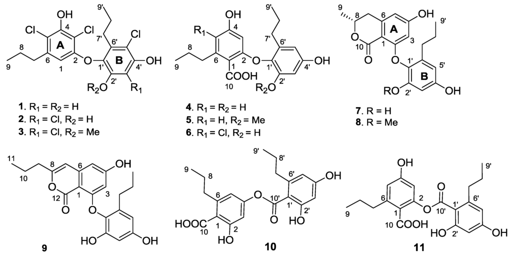 n-propyl protons, assigned a 5′-substituted and 1′-oxygenated 2′,4′-dihydroxy-6′-propylphenyl ring. Since two aromatic rings covered eight degrees of the molecular unsaturation, the connection of rings A and B was suggested through a C-C bond or an ether bond. The observation of NOE interaction between H-1 and OH-2′ (