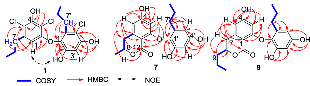 Figure 2) assumed an ether linkage across C-2 and C-1′. Thus, the quaternary carbons C-3, C-5 and C-5′ were substituted by chlorine atoms.