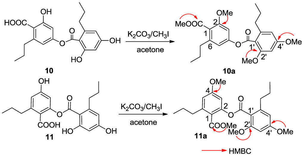 Compound 10 (5.0 mg) was dissolved in anhydrous acetone (900 µL), and then K2CO3 (3.8 mg) and CH3I (650 μL) were added to the solution, which was stirred for 16 h at 0 °C. After filtration, the solution was concentrated in vacuo, and the residue was purified on a silica gel column eluting with petroleum ether-Me2CO (20: 1) to obtain the methyl ether 10a (2.9 mg, 58% yield). Compound 11 is submitted to the same protocol as for 10 to derive a methylated product 11a.