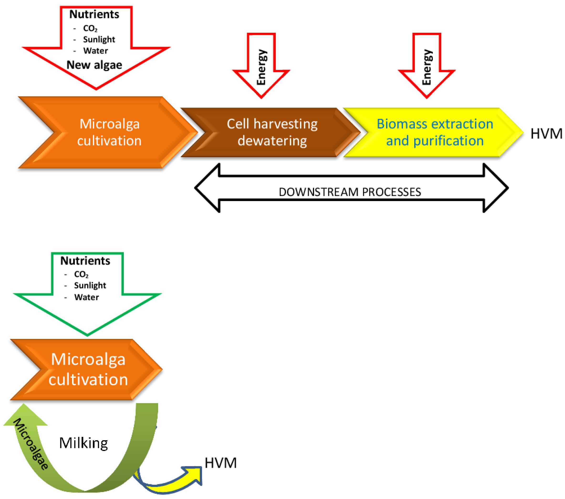 Scheme presenting milking as an alternative to current processes. (Top): Current processes are systems that require starting new microalgal cultures for each batch of HVM, with fresh nutrients; (Bottom): Milking only requires inputs of carbon dioxide and water used up in producing HVM, and thus is closer to a closed system.