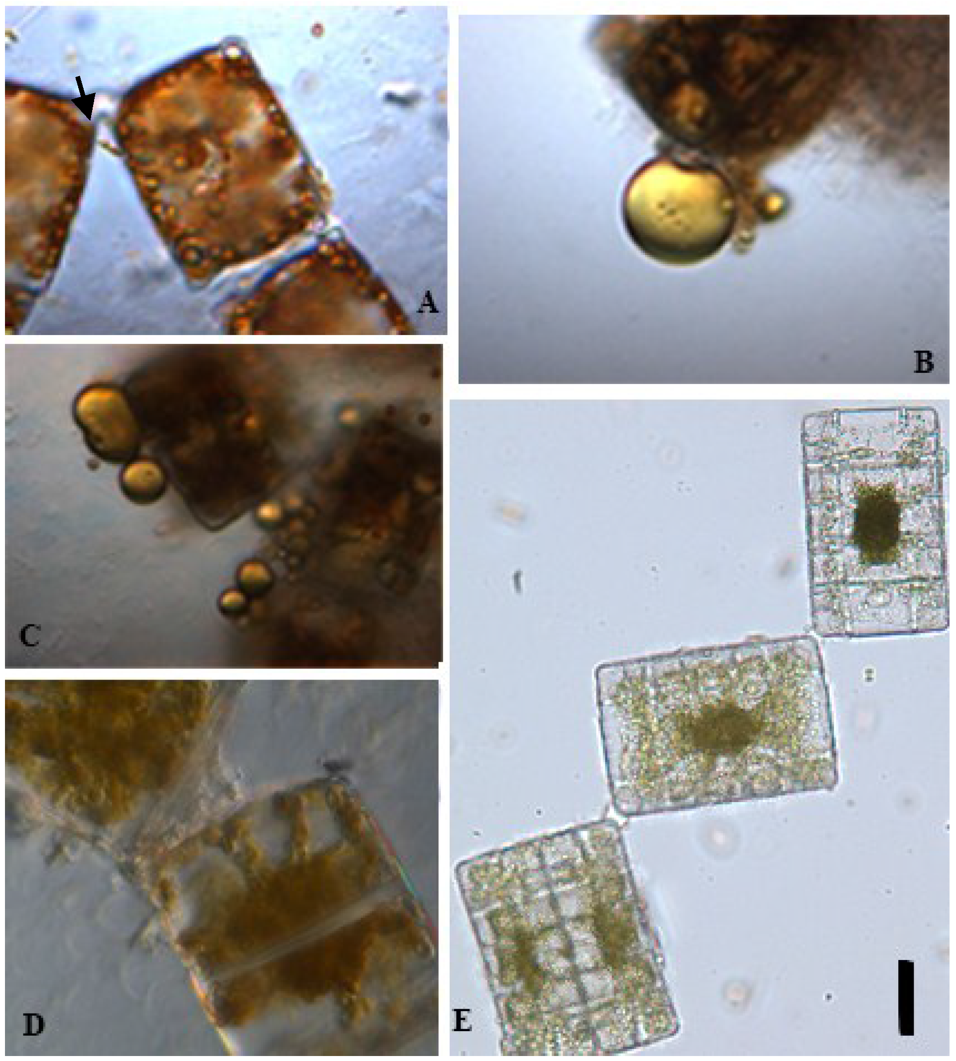 Terpsinoë musica is a freshwater diatom that releases oil under mechanical pressure on the cover slip. Scale bar = 10 µm. (A) Freshly collected Terpsinoë musica; (B,C) Terpsinoë musica cells kept 7 days in an incubator released oil when mechanically pressed; (D) Terpsinoë musica divides 10 days after oil release; (E) Zigzag colony of Terpsinoë musica.
