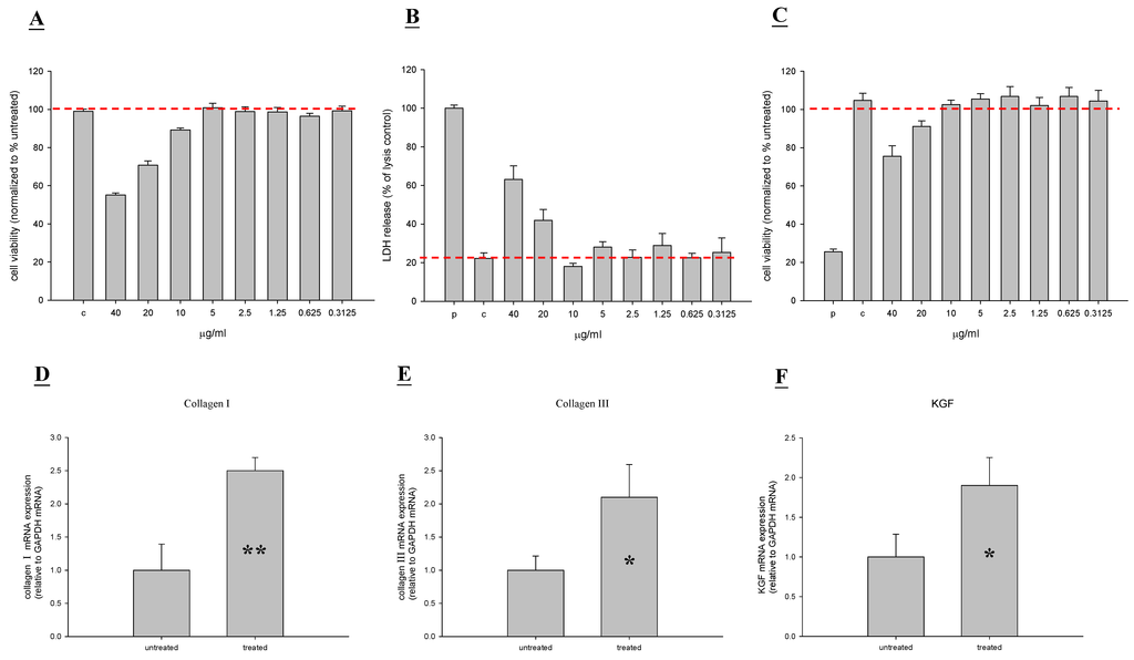 We first studied the cell toxicity of TP4 in a fibroblast cell line (Hs-68) and keratinocyte cell line (HaCaT) using neutral red, LDH, and MTT assays; we observed that TP4 at various concentrations up to 20 μg/mL affects cell viability in the Hs-68 line (Figure 1A–C). In addition, cell proliferation was significantly increased by low doses (2.5~10 μg/mL), as reflected by the change in cell viability as compared to the untreated group. We subsequently investigated the effect of TP4 on cell proliferation factors. Collagen and keratinocyte growth factor (KGF) are important performance factors for cell proliferation []. We thus analyzed collagen I and III, and KGF gene expression in TP4 treated Hs-68 cells. Expression of all genes was enhanced by TP4 treatment, as compared to expression in the controls (Figure 1D–F).