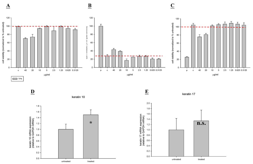 TP4 at tested concentrations (down to 10 μg/mL) did not affect the viability of HaCaT cells (Figure 2A–C). Of the proliferation and differentiation mediators in this keratinocyte cell line (HaCaT), keratin 10 and 17 are of particular importance, because they play a major role in coordinating protein synthesis and cell growth mechanisms []. As shown in Figure 2D, TP4 significantly increased gene expression of keratin 10, but did not affect that of keratin 17 (Figure 2E). Therefore, our results indicate that TP4 enhances Hs-68 and HaCaT cell proliferation, possibly through activation of the genes encoding collagen I and III, KGF, and keratin 10.